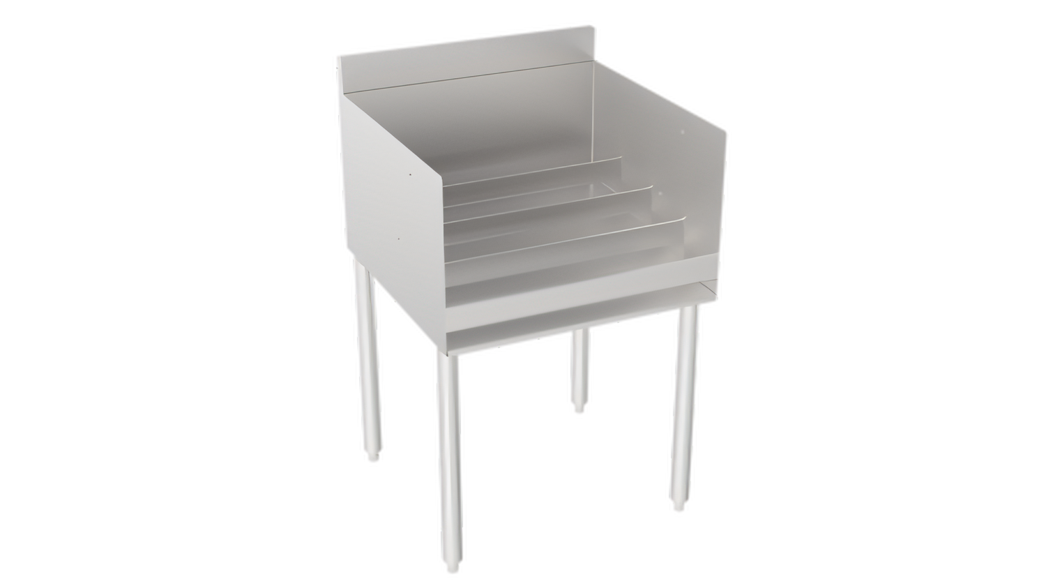 Silver Series 4-Step Raised Liquor Display, 24" W x 22.5" D, 3” H backsplash, Durable stainless steel construction, 1-5/8” tubular legs with gray plastic bullet feet, Pre-drilled rivnuts for easy attachment in the field, NSF