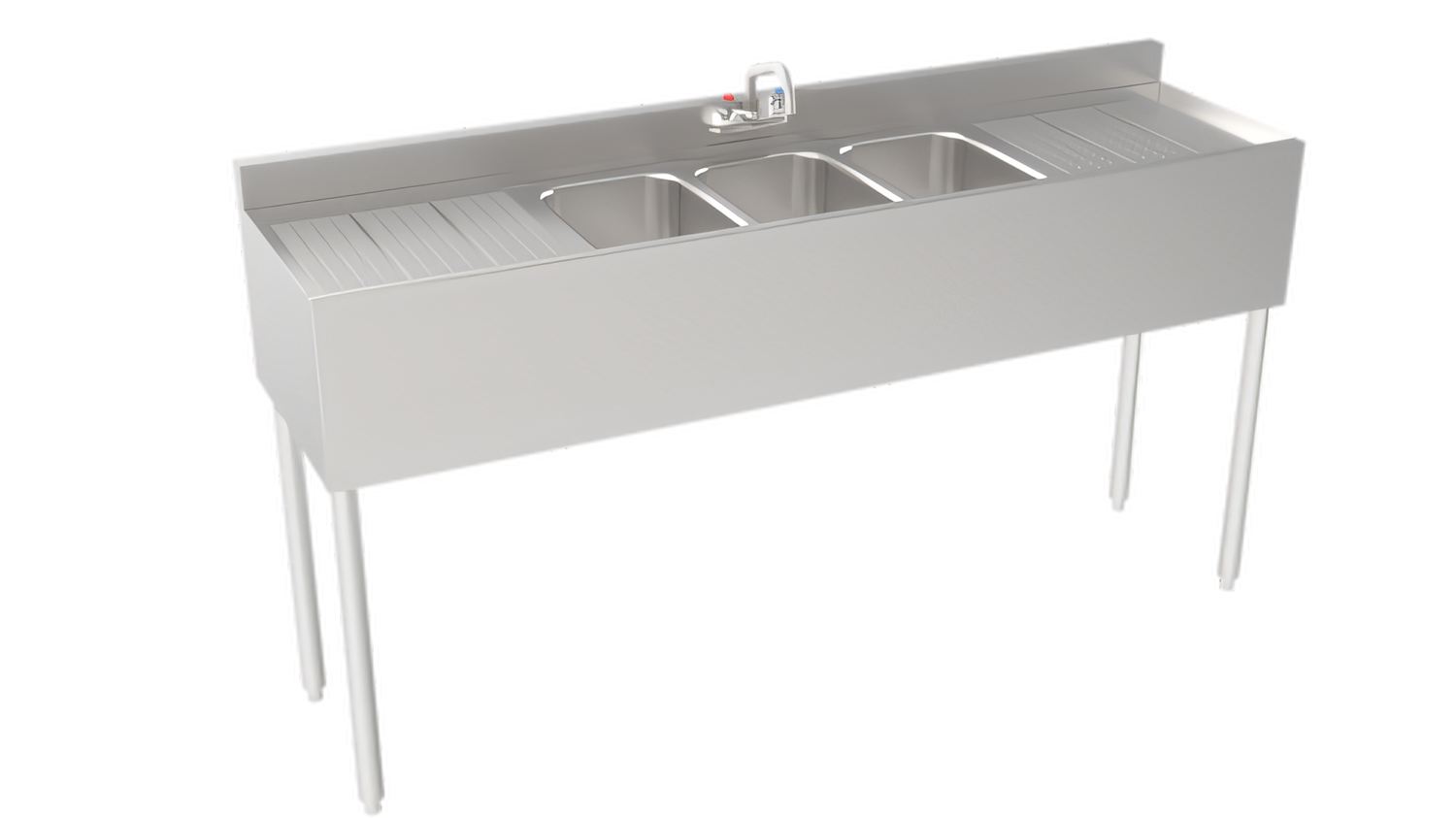 Silver Series Three Compartment Sink with Left and Right Drainboards, 72" W x 18.5" D, (3) 10"D x 14"W x 10"H bowl size, (3) 1-1/2" drains, 3” H backsplash with wall mount faucet included with quarter turn ceramic valves, Durable stainless steel construction, 1-5/8” tubular legs with gray plastic bullet feet, Pre-drilled rivnuts for easy attachment in the field, NSF