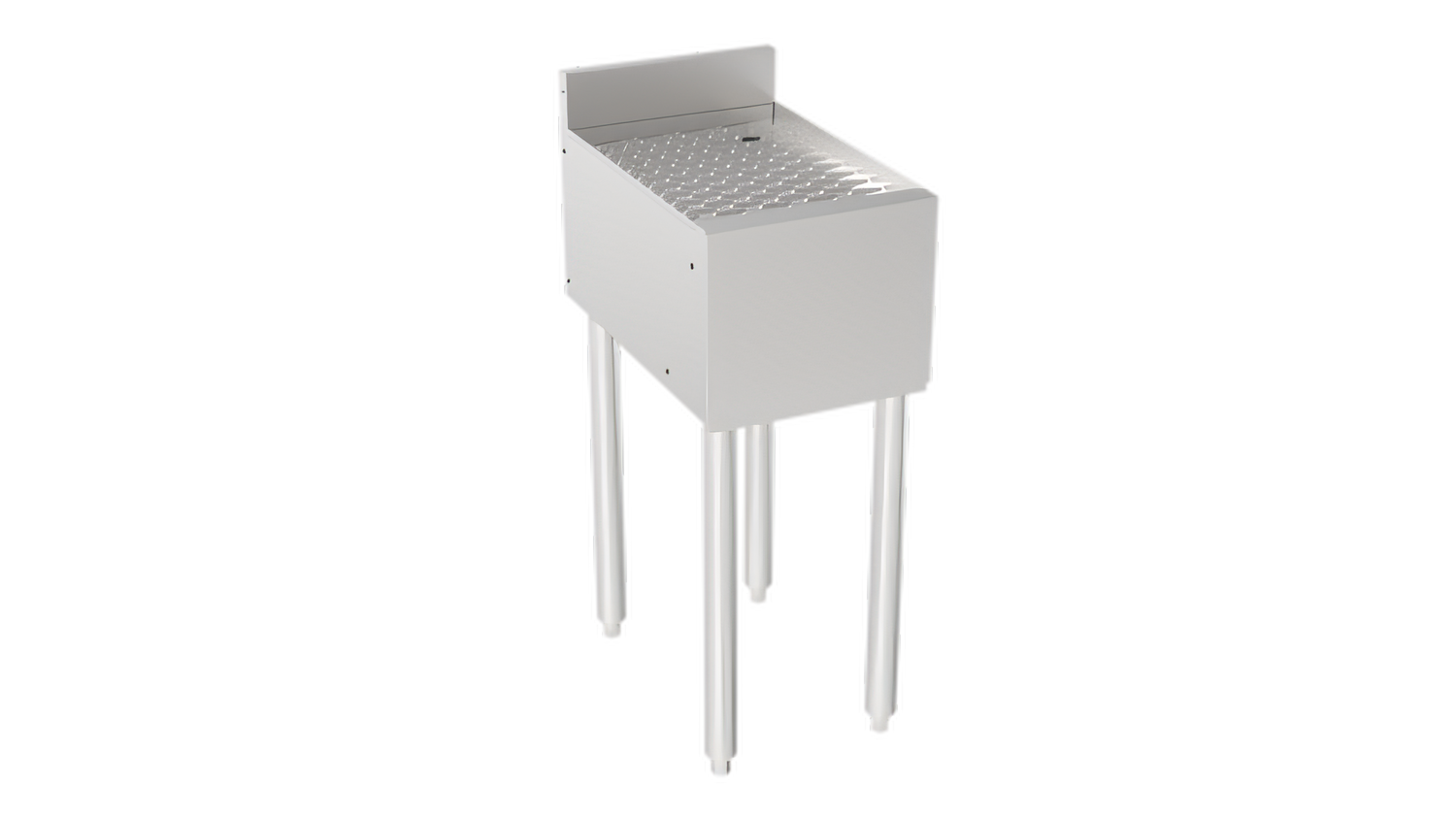 Silver Series Drainboard, 12"W x 18.5"D, Embossed drainboard top, 3” H backsplash, 1" Drain, Durable stainless steel construction, 1-5/8” tubular legs with gray plastic bullet feet, Pre-drilled rivnuts for easy attachment in the field, NSF