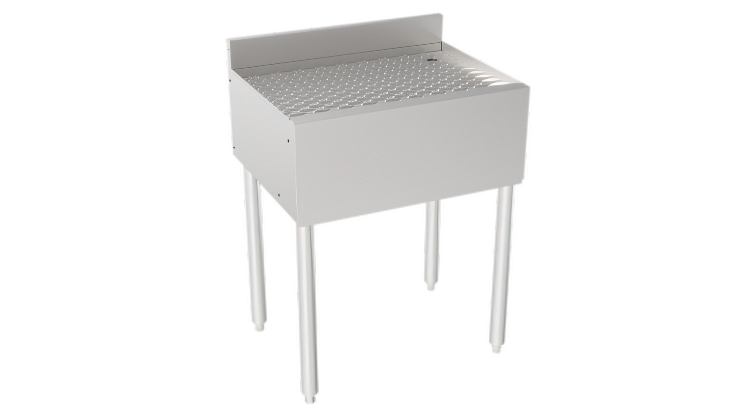 Silver Series Drainboard, 24"W x 18.5"D, Embossed drainboard top, 3” H backsplash, 1" Drain, Durable stainless steel construction, 1-5/8” tubular legs with gray plastic bullet feet, Pre-drilled rivnuts for easy attachment in the field, NSF