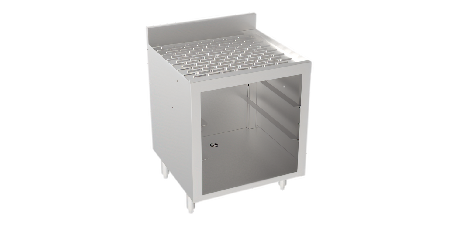 Silver Series Glass Rack Storage Cabinet with 3 Levels of Storage (Rack Slides Included), 24"W x 22.5"D, Fits (3) 20" x 20" Glass Racks (not included), Embossed drainboard top, 3” H backsplash, (2) 1" Drains, Durable stainless steel construction, 1-5/8” tubular legs with gray plastic bullet feet, Pre-drilled rivnuts for easy attachment in the field, NSF