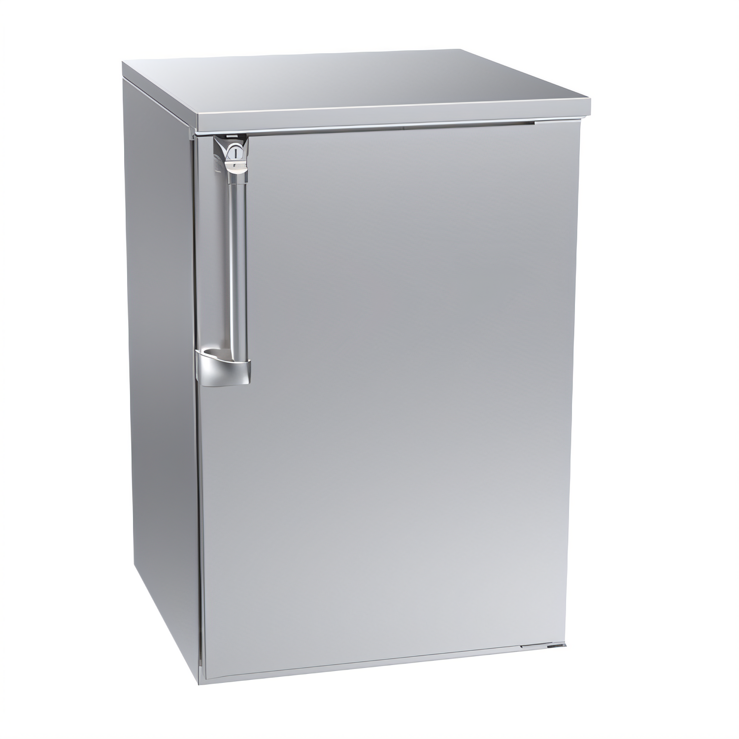 - Heavy-duty self-closing hinged door with recessed stainless handle and factory-installed lock.