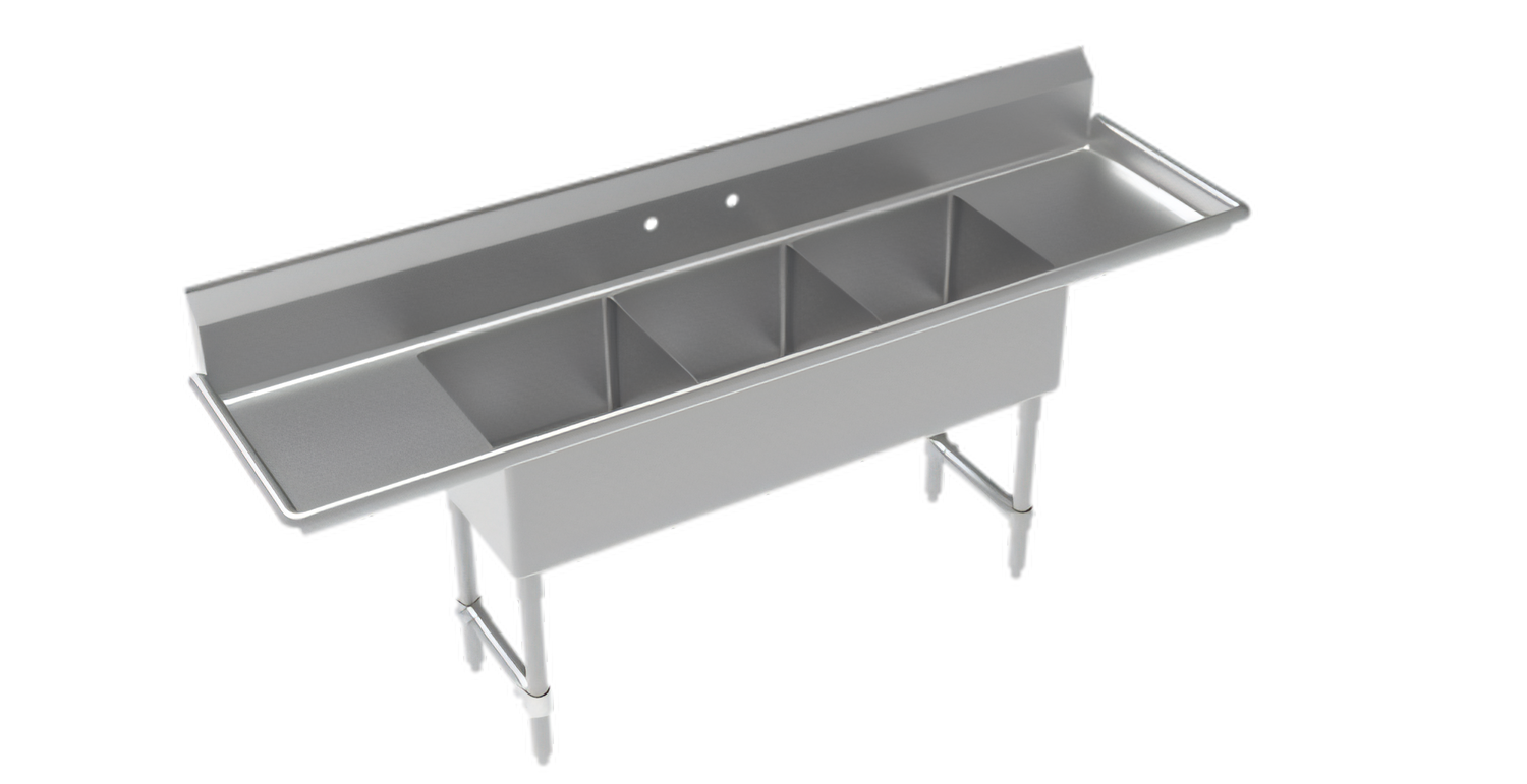 Royal Series 3-Compartment Commercial Sink with left & right drainboards, 90"W x 24"D x 43"H, (3) 18"x 18" deep bowls with 4.5" drains, 38" working height, 18 gauge 304 Series Stainless Steel construction, stainless steel legs with adjustable thermoplastic bullet feet