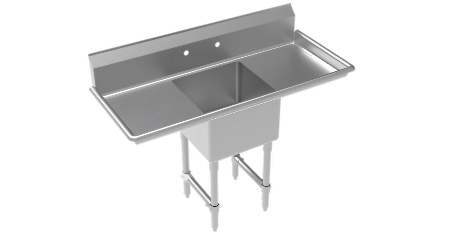 Royal Series 1-Compartment Commercial Sink with left & right drainboards, 54"W x 24"D x 43"H, 18"x 18" deep bowl with 4.5" drain, 38" working height, 18 gauge 304 Series Stainless Steel construction, stainless steel legs with adjustable thermoplastic bullet feet
