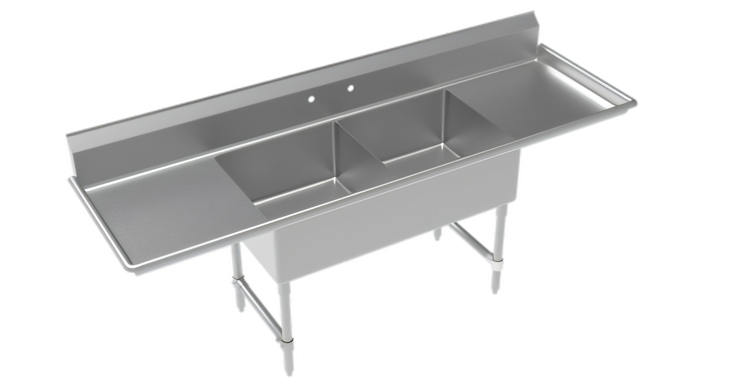 Royal Series 2-Compartment Commercial Sink with left & right drainboards, 96"W x 24"D x 43"H, (2) 24"x 24" deep bowls with 4.5" drains, 38" working height, 18 gauge 304 Series Stainless Steel construction, stainless steel legs with adjustable thermoplastic bullet feet