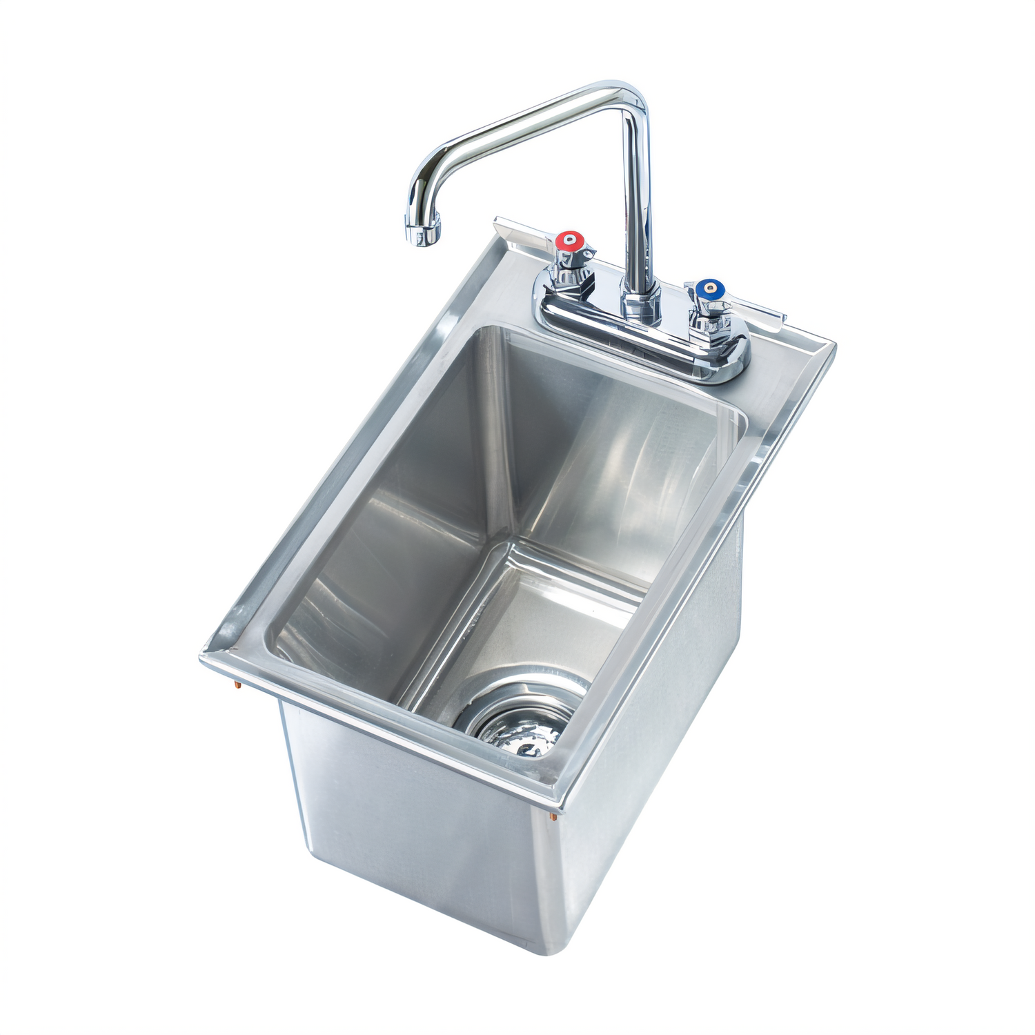 Drop-In Hand Sink, 10"W x 16"D x 15"H OA, 8" wide x 12" front-to-back x 10" deep compartment, 4" OC deck mount faucet with 6" double bend spout (low lead compliant), 5-1/2" rear & side splashes on left & right, 3-1/2" drain, stainless steel construction, NSF (7-1/2"W x 14-3/4"D cut-out required)