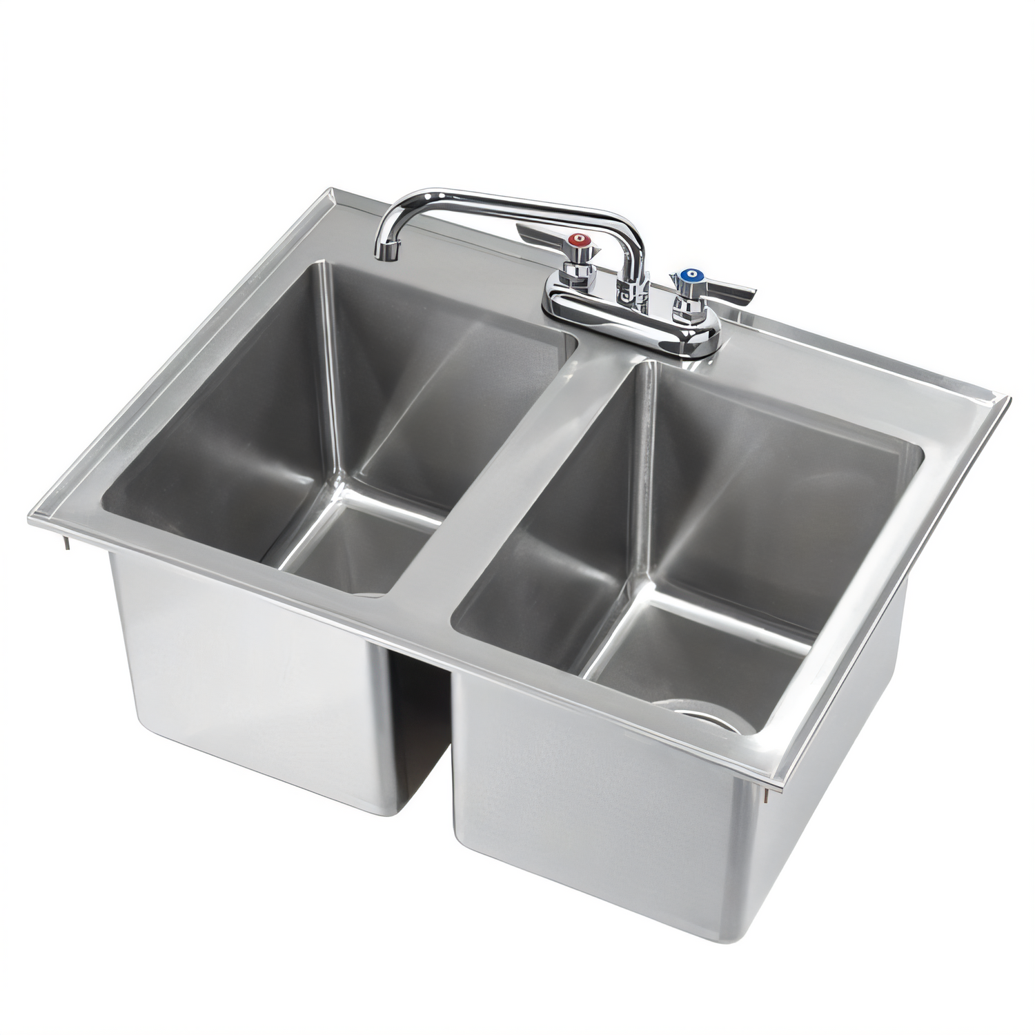 Hand Sink, two-compartment, drop-in, 26"W x 18"D x 10"H OA, (2) 10" wide x 14" front-to-back x 10" deep compartments, 4" OC deck mount faucet with 10" spout, (2) 3-1/2" drains, stainless steel construction, NSF (22-1/4"W x 16-3/4"D cut-out required)