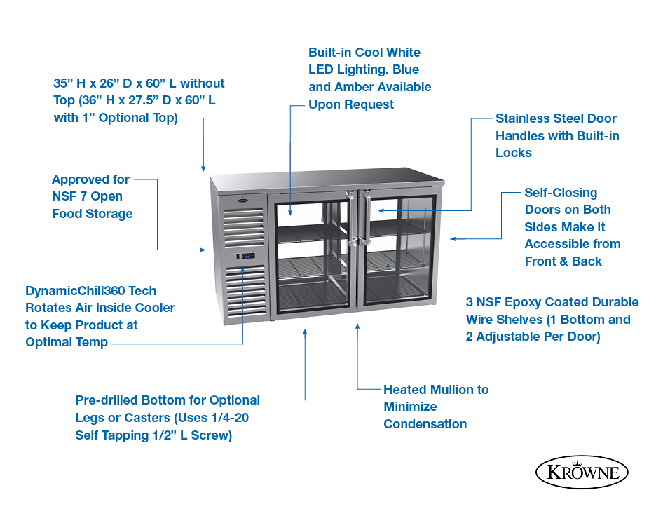 Model KPT52L · Two-Section · Left-Side CompressorGive bartenders instant access from both sides of the bar while keeping every bottle perfectly chilled. The Krowne Royal Series KPT52L combines rugged stainless-steel construction with energy-efficient, eco-friendly refrigeration to handle the busiest service with ease.