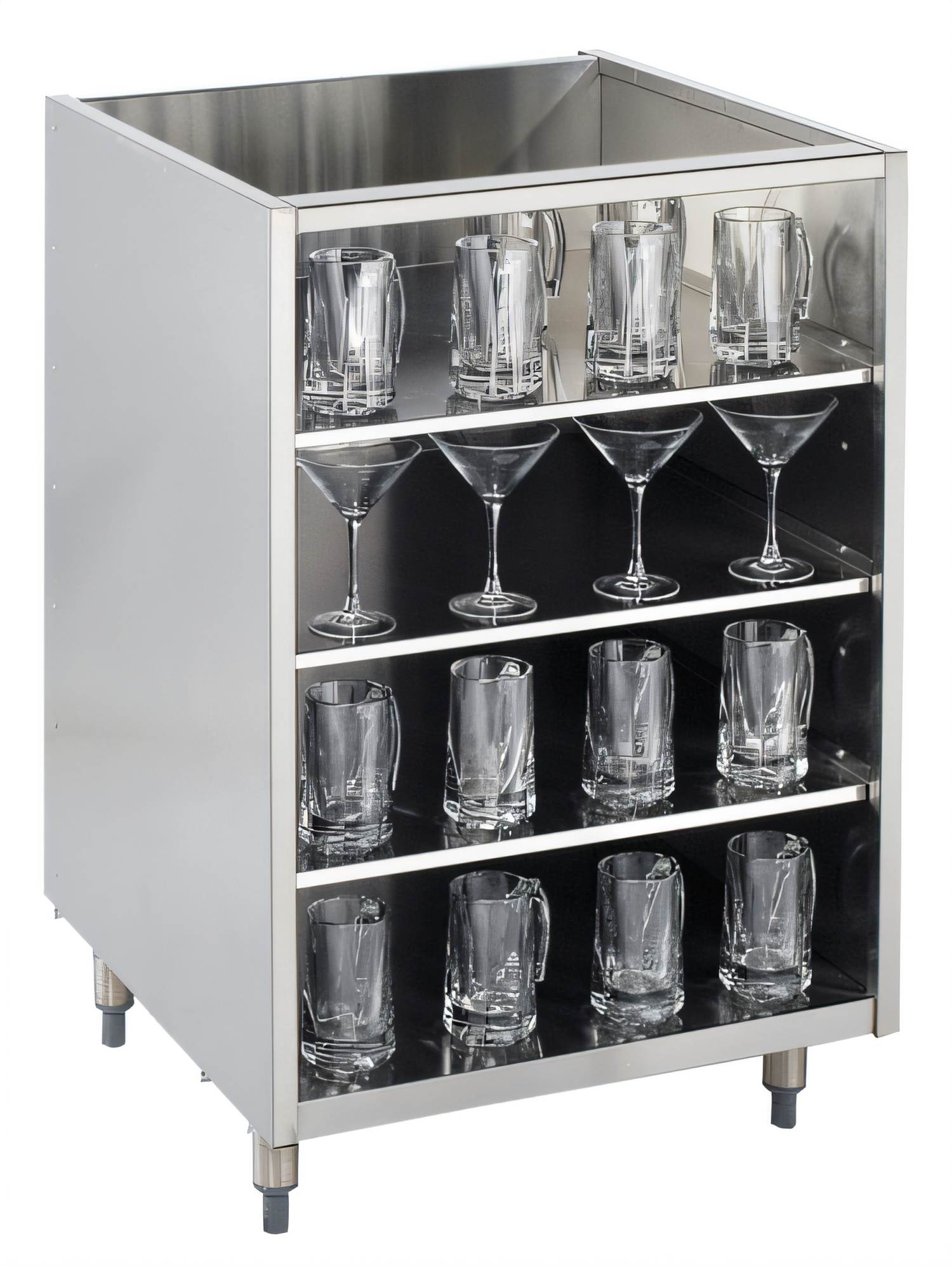 - (3) full-width stainless steel shelves with 7 ½" clearance for stemware, pints, rocks glasses, and more.