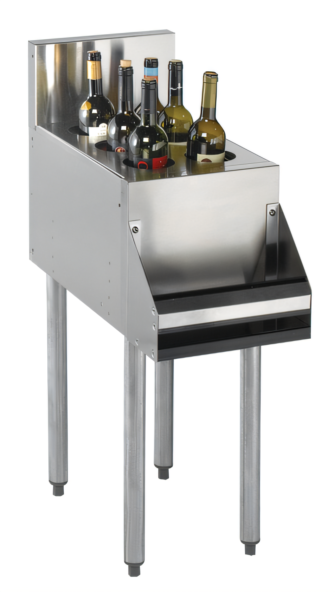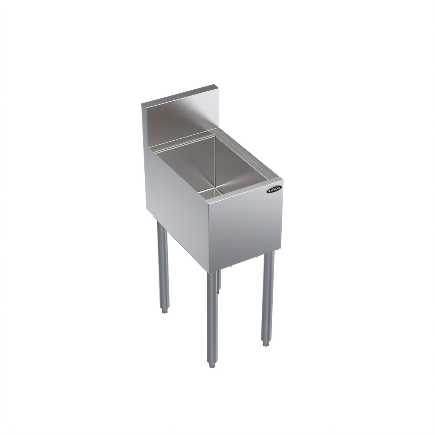Royal Series Underbar Bottle Storage/Ice Bin, insulated, 12"W x 19"D, holds (6) bottles, 32lbs. ice capacity, 10" deep stainless steel bin liner, 1" drain, stainless steel top, front, & sides, galvanized steel back & bottom, stainless steel legs with adjustable thermoplastic bullet feet, NSF