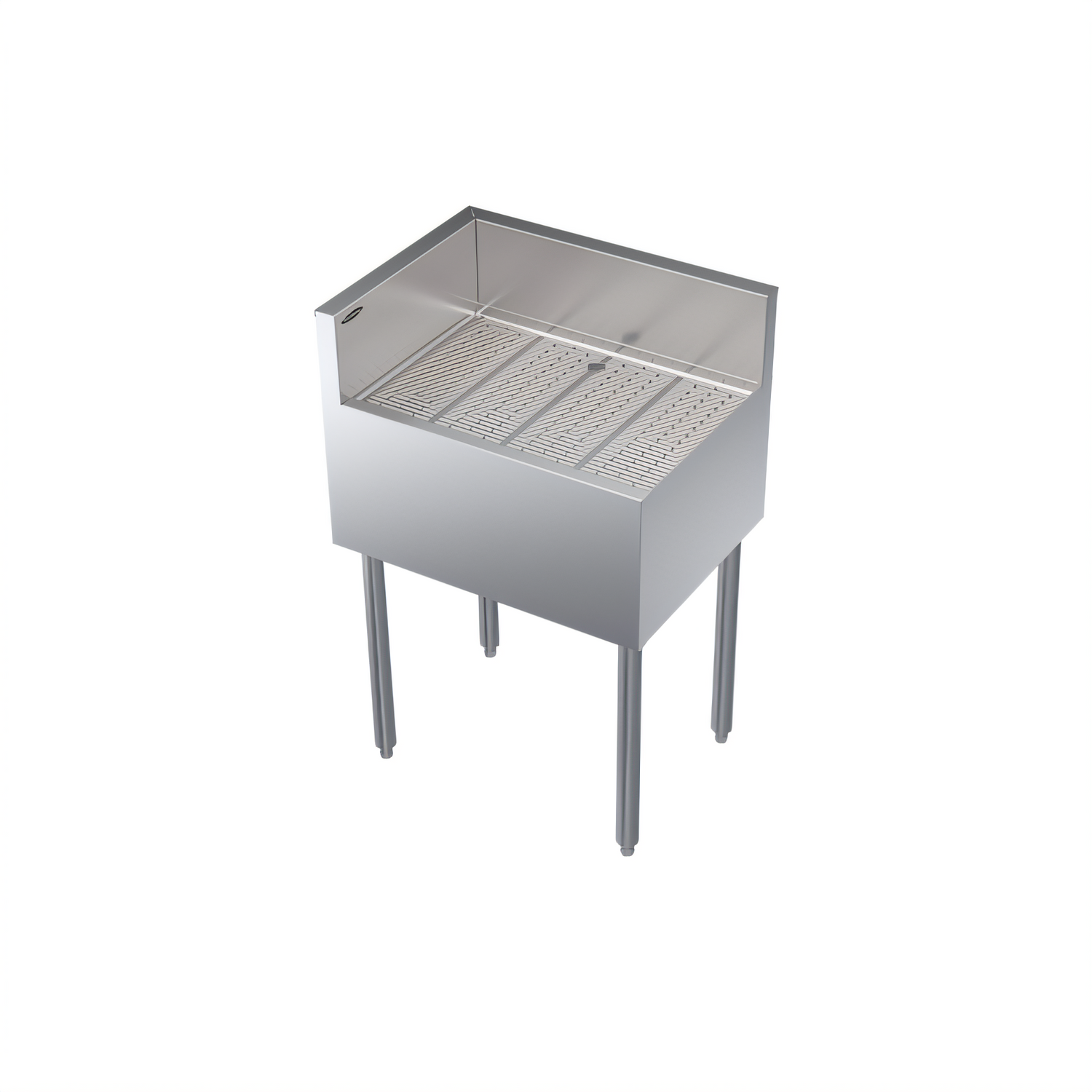 Royal Series Underbar Corner Drainboard, free standing, 24"W x 19"D x 36-1/2"H.O.A., left end return, embossed top with 1" drain, stainless steel top, front, & sides, stainless steel legs with adjustable thermoplastic bullet feet, NSF
