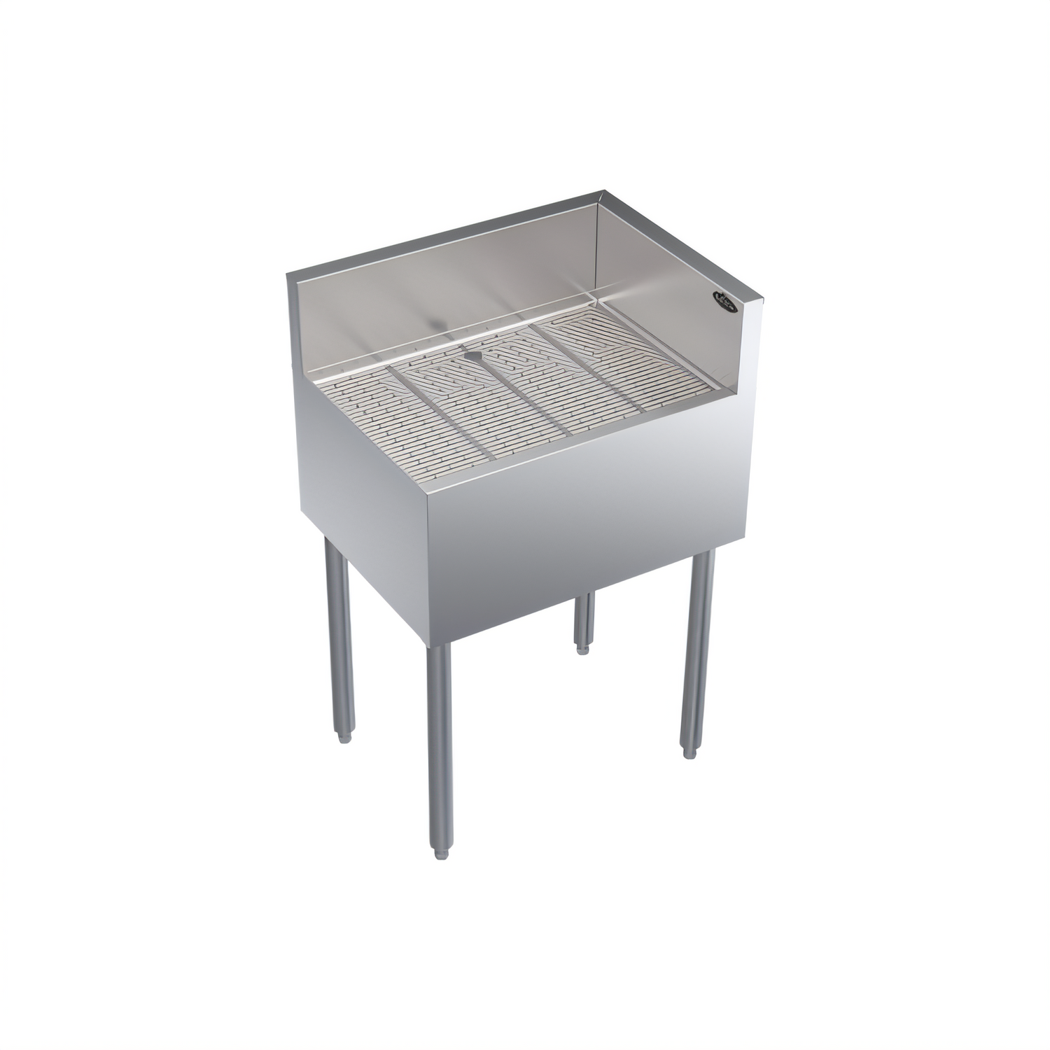 Royal Series Underbar Corner Drainboard, free standing, 24"W x 19"D x 36-1/2"H.O.A., right end return, embossed top with 1" drain, stainless steel top, front, & sides, stainless steel legs with adjustable thermoplastic bullet feet, NSF