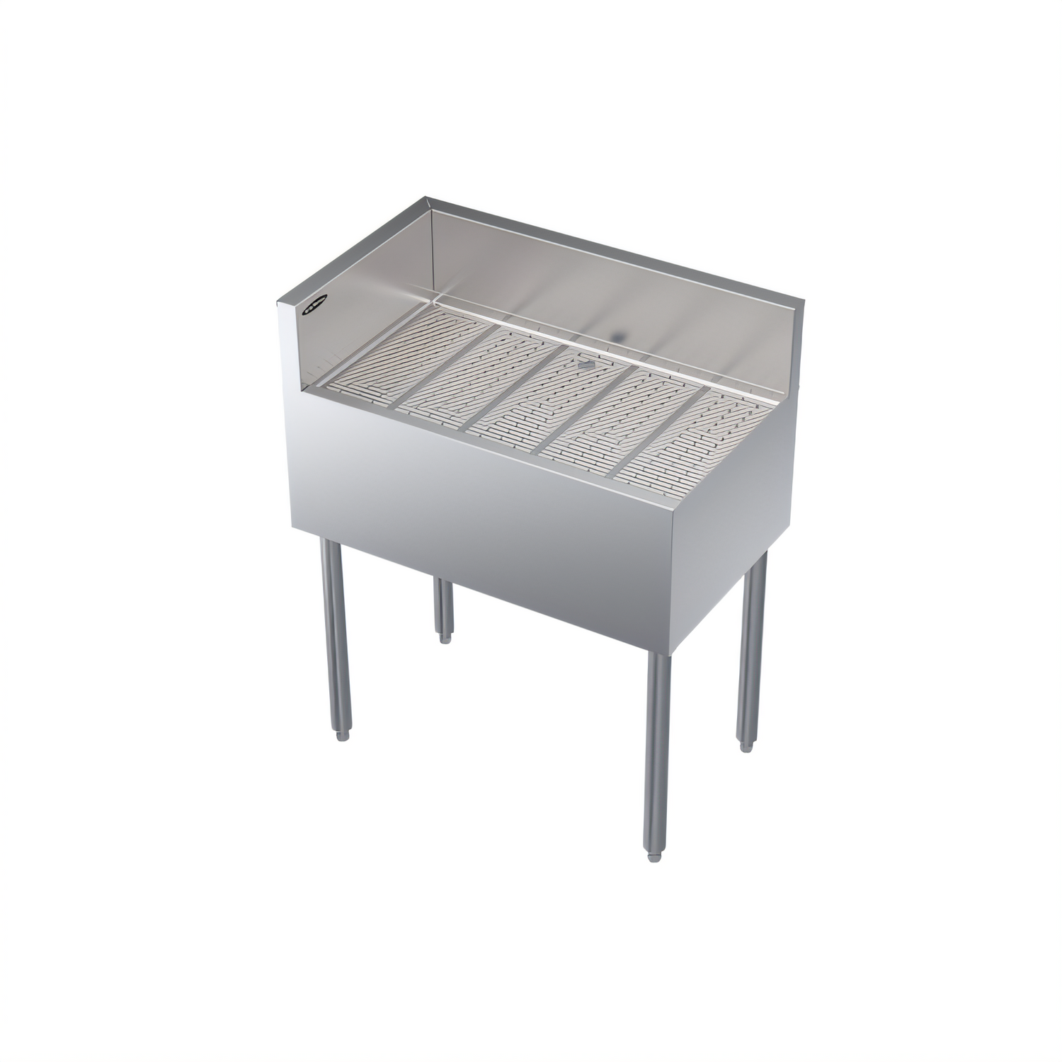 Royal Series Underbar Corner Drainboard, free standing, 30"W x 19"D x 36-1/2"H.O.A., left end return, embossed top with 1" drain, stainless steel top, front, & sides, stainless steel legs with adjustable thermoplastic bullet feet, NSF