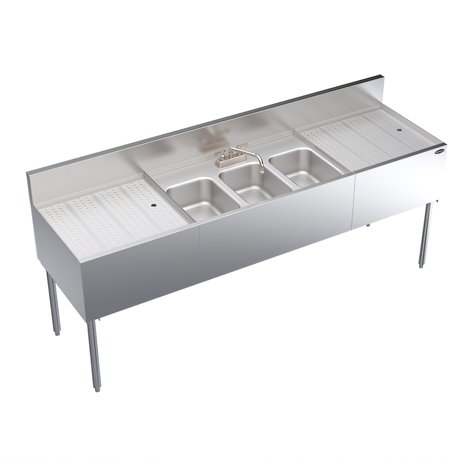 24" deep • Dual 24" embossed drainboards • NSF/ANSI 2 compliantKeep glassware moving and health codes satisfied with Krowne’s flagship Royal Series underbar sink. Engineered from durable stainless steel and delivered complete with faucet, drains and standpipes, this 84-inch workhorse creates a dedicated wash/rinse/sanitize station while doubling as a spacious landing zone for drying and staging.