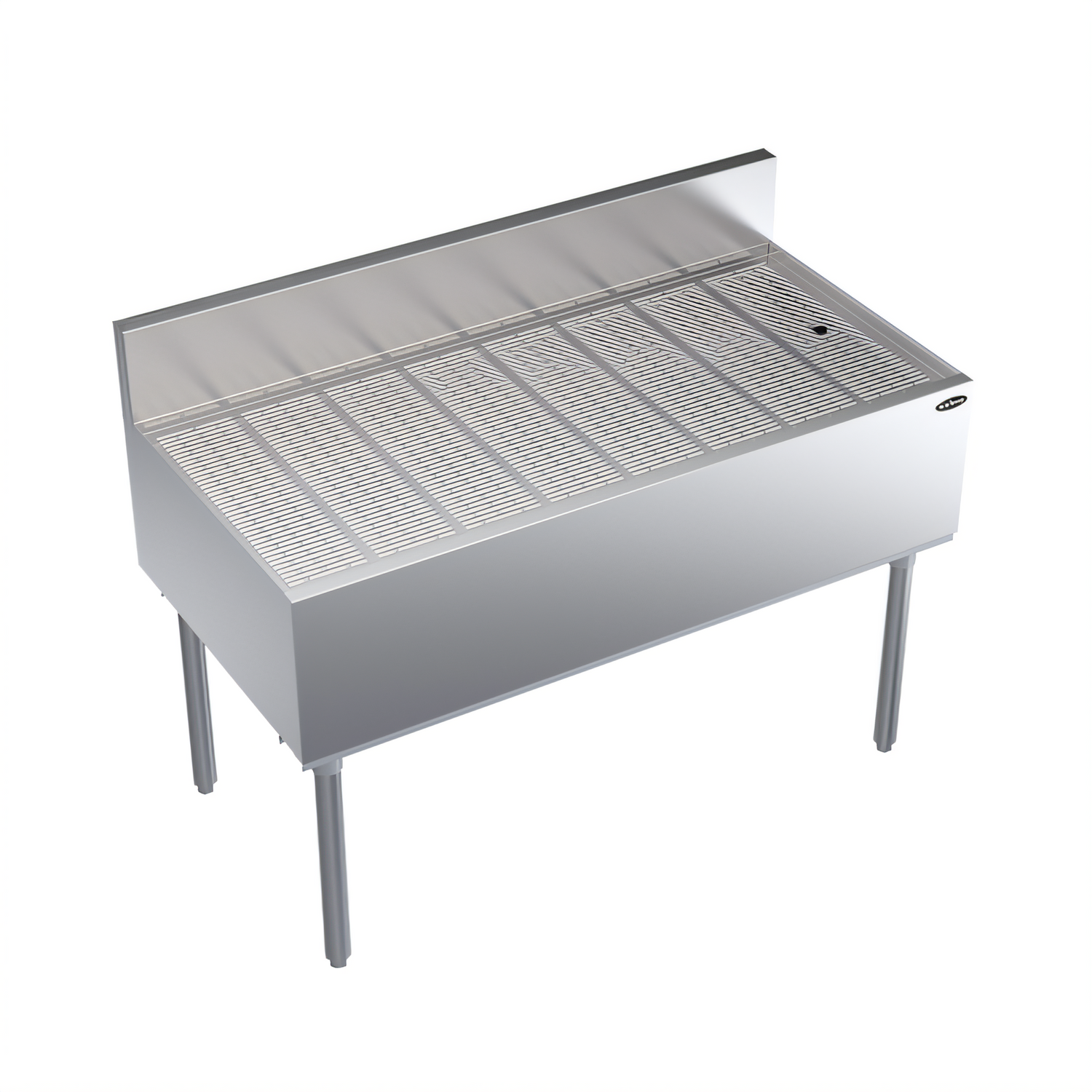 Model KR24-GS48 | NSF/ANSI Standard 2 CertifiedBuilt for high-volume beverage programs, the Krowne Royal Series free-standing drainboard delivers rugged performance in a compact 48" footprint. Its embossed 20-gauge stainless steel work surface quickly drains excess liquid through a welded grid into a 1" IPS waste, keeping your bar top clean and service-ready.