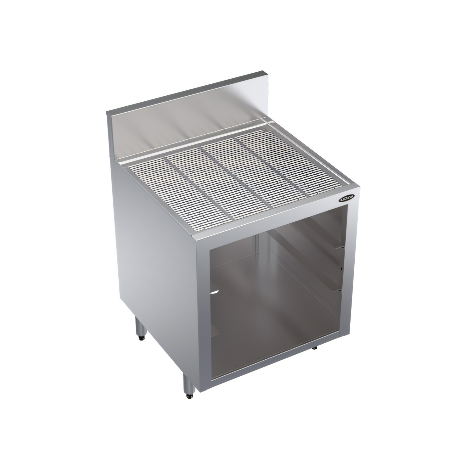 24" x 24" Underbar Unit • Drainboard Top • Holds three 20" x 20" racksBuilt for busy bars that never compromise on speed or sanitation, the Krowne KR24-GSB1 keeps glassware organized, air-dried and within arm’s reach. This 24 inch Royal Series cabinet combines a heavy-duty stainless drainboard with an open front storage bay equipped with adjustable rack slides for up to three standard 20" x 20" glass racks (racks sold separately). Rugged, easy to clean and fully NSF listed, it’s the professional’s choice for back-bar glass management in restaurants, clubs and tasting rooms.