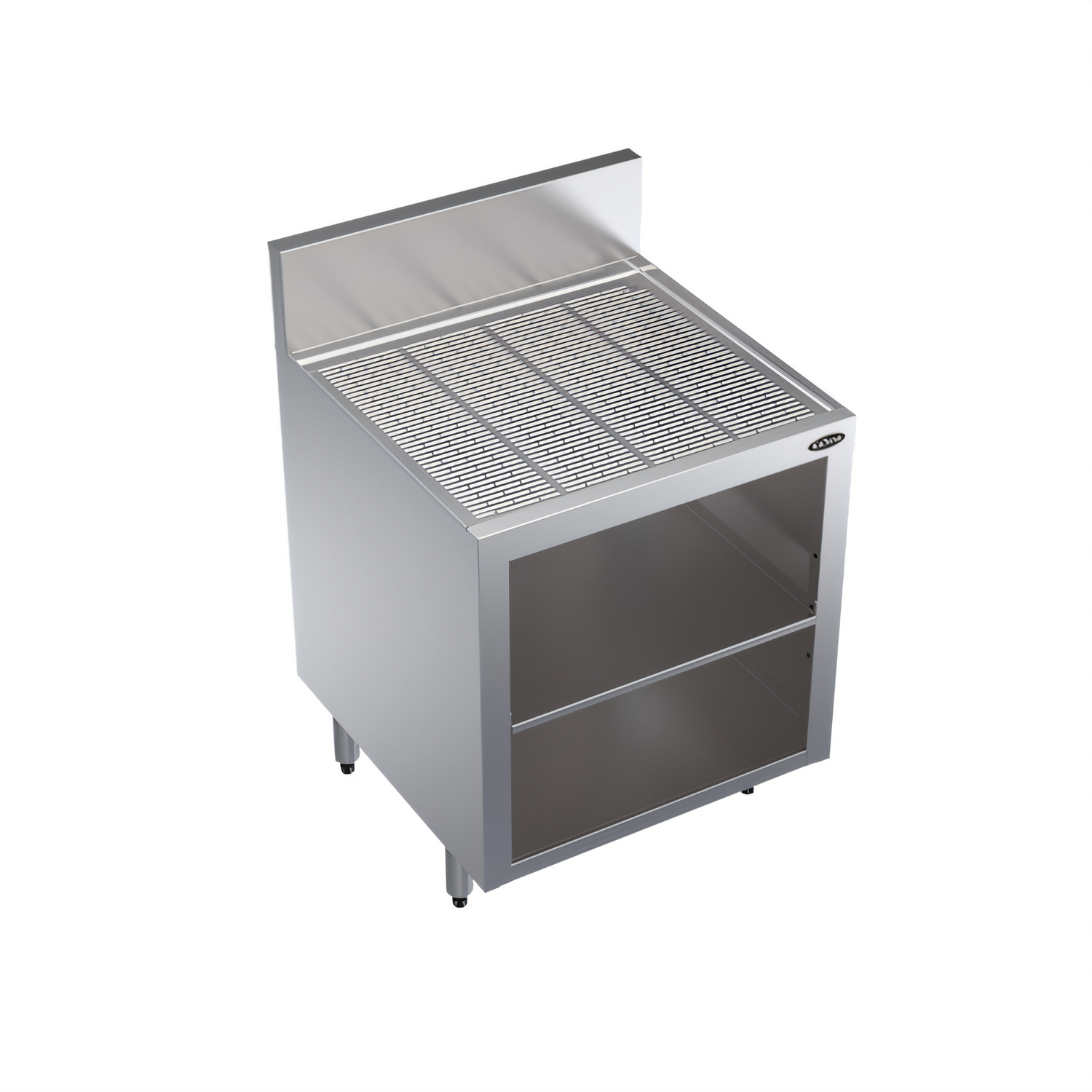 Model KR24-GSB3 | NSF ListedStreamline your dishroom or bar service with this space-saving 24" x 24" cabinet. The Royal Series KR24-GSB3 combines a reinforced stainless steel drainboard work surface with quick-access open storage for two full-size 20" x 20" glass racks—perfect for staging clean glassware exactly where you need it.