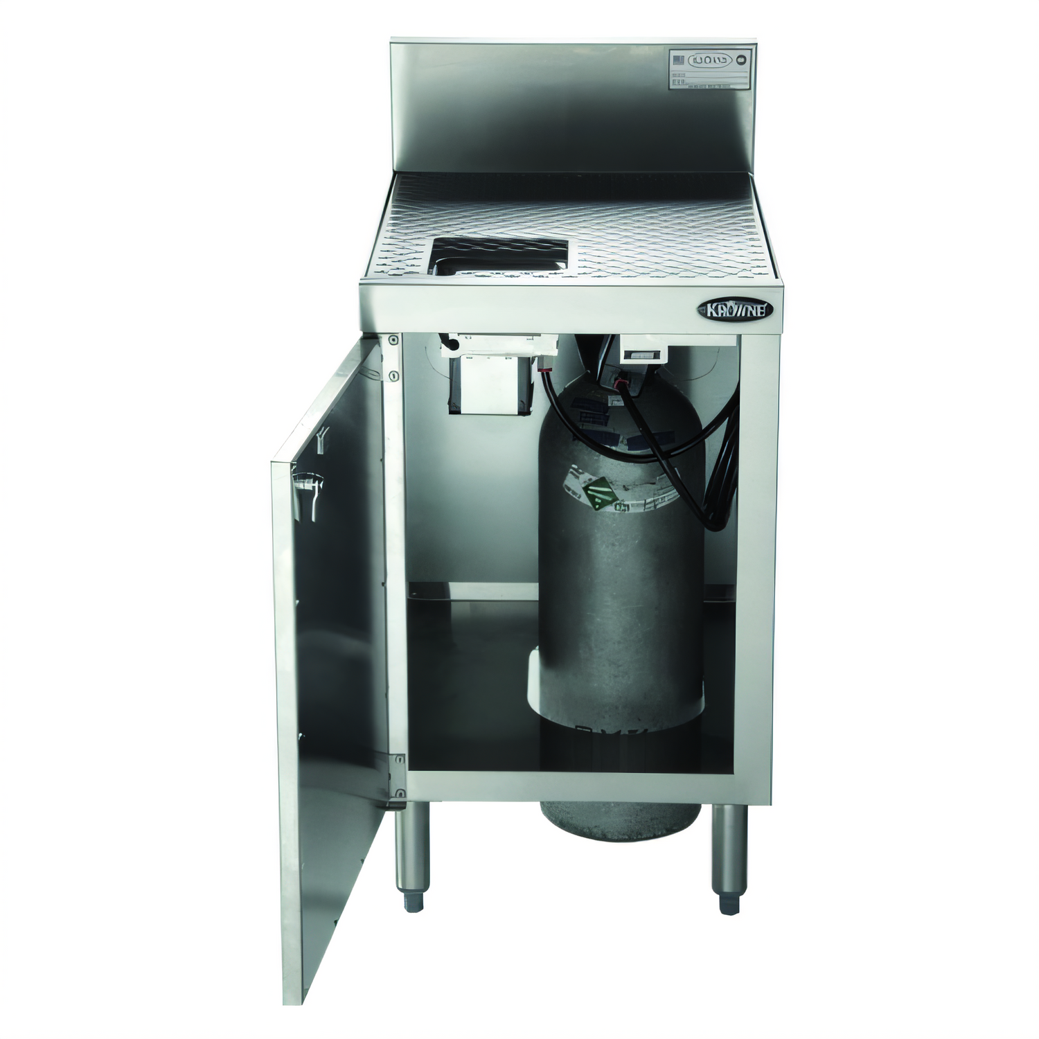 - Lockable base cabinet conceals a CO₂ cylinder; pre-cut floor opening lets the tank rest safely on the ground.