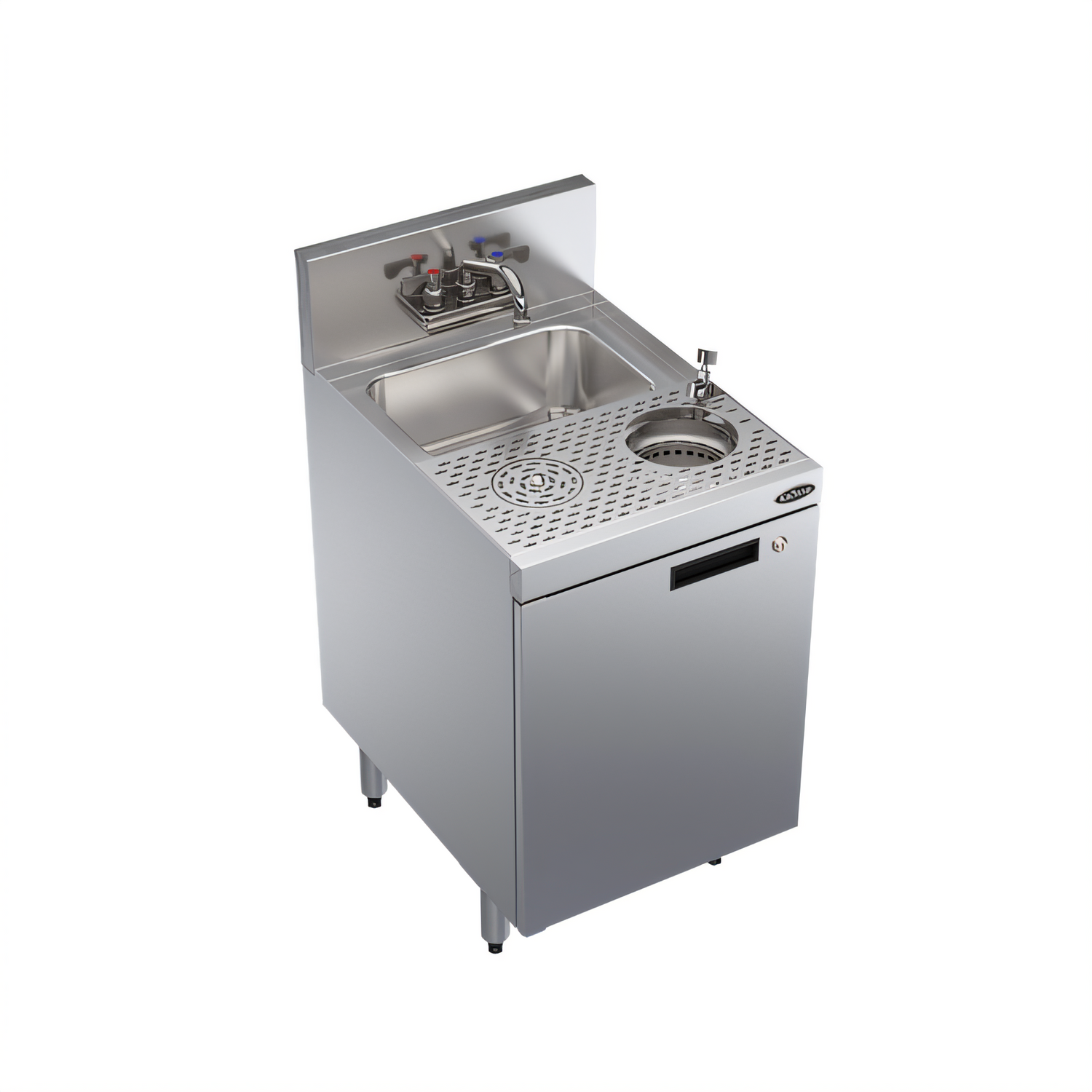 Model KR24-MS18-C | NSF ListedStreamline drink prep, glass care, and utensil sanitation in one compact 18" × 24" footprint. Built for the busiest bars, this Royal Series speed unit combines a dump sink, high-performance glass rinser, and tool well—all protected inside a secure stainless steel cabinet base.