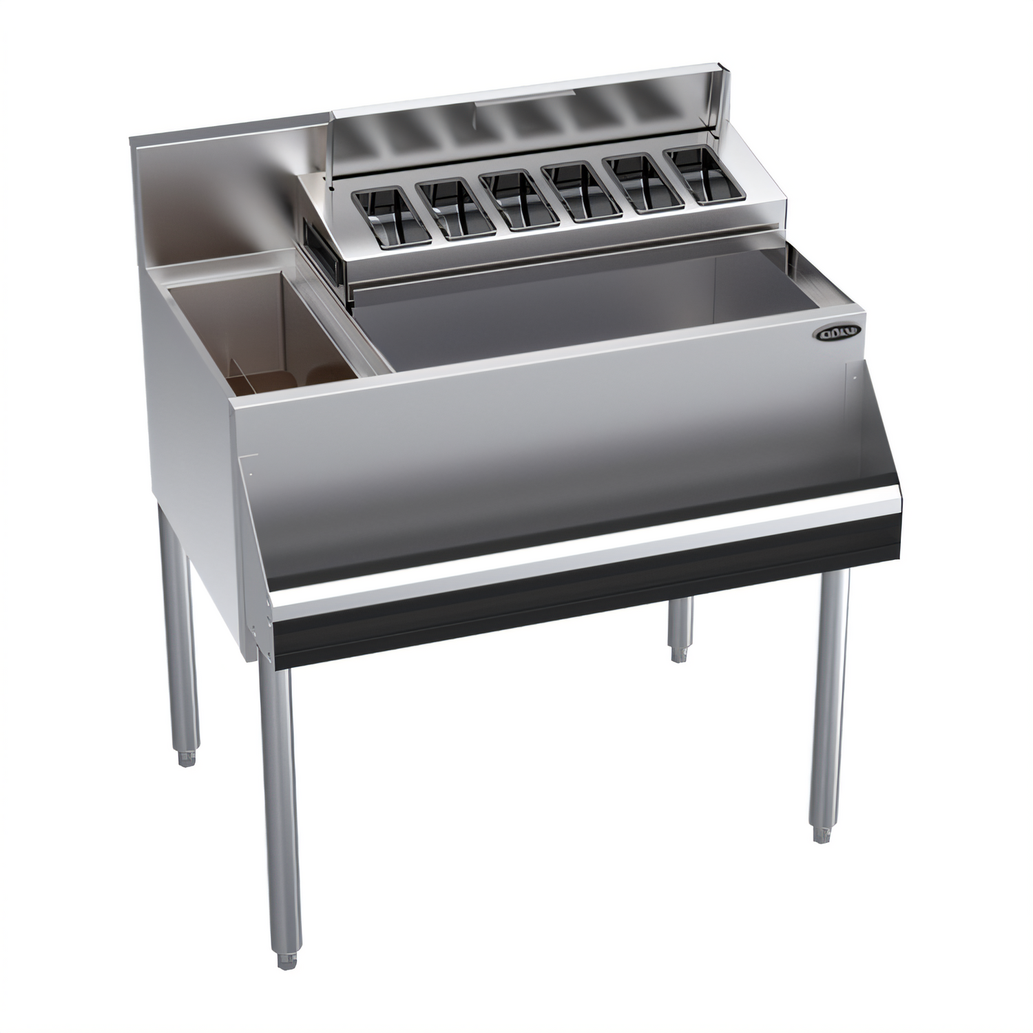 Model KR24-MS32R-10 | NSF & ETL-Sanitation ListedPurpose-built for high-volume craft cocktail programs, this Royal Series multi-station combines a 74 lb. ice bin, 10-circuit cold plate and dedicated wells for garnishes, elixirs and speed-rail liquor bottles—all in a compact 32" footprint that keeps bartenders fast, organized and profitable.