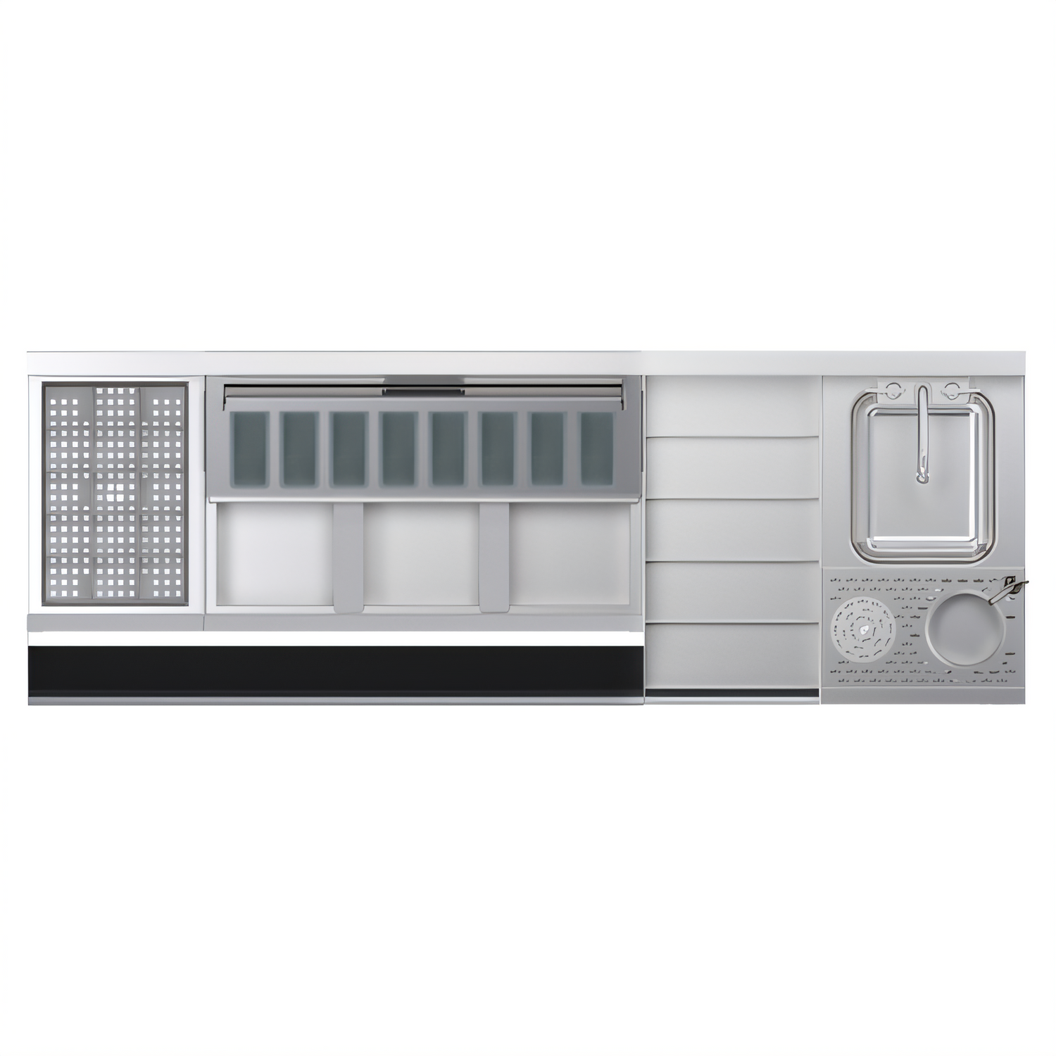 - 14″ dump sink with 10″ × 12″ × 7″ bowl, high-performance glass rinser and tool caddy (pressure regulator included).