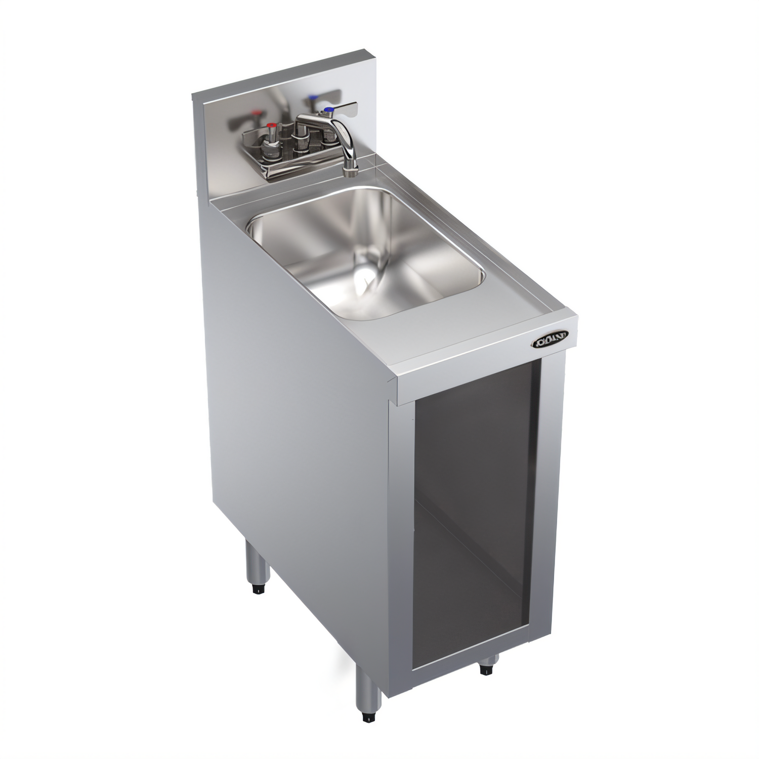 Model KR24-S12C • Open-Front Cabinet BaseKeep sanitation front and center—without surrendering precious bar space. The Krowne Royal Series underbar hand sink delivers a full-size wash station in a slim 12-inch footprint, matching the depth of standard speed rails for a seamless install.