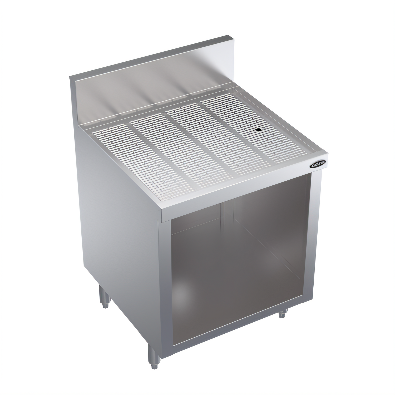 Model KR24-S24 | NSF Certified Stainless SteelPerfectly sized for tight bar layouts, this 24" x 24" Krowne Royal Series drainboard keeps clean glassware draining while offering instant, open-front storage for bus tubs, glass racks, or backup supplies. Built entirely of corrosion-resistant stainless steel, it’s the durable, easy-clean workhorse every busy bar needs.