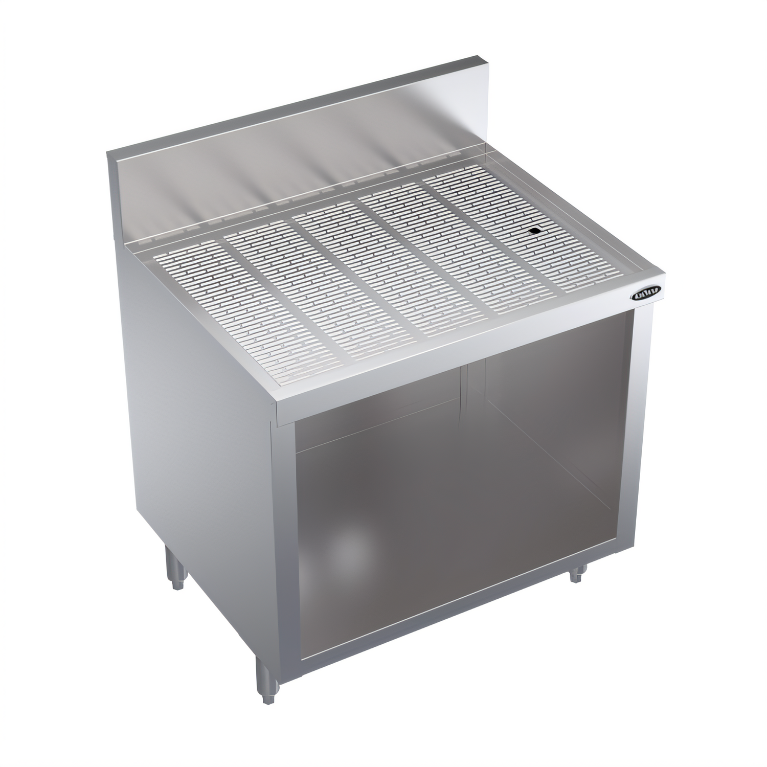 - Open cabinet base keeps bus tubs, chemicals and bar supplies within instant reach.