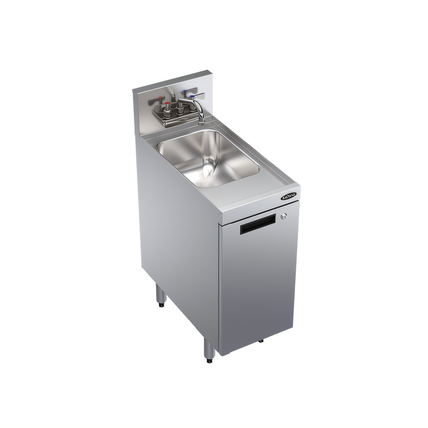 Krowne Model KR24-SD12C-10 • NSF ListedEngineered for the demands of high-volume bars, restaurants and stadium concessions, this Royal Series underbar cabinet combines lockable chemical storage with a deep dump sink and faucet—all in a compact 12-inch footprint that lines up flush with standard 24 inch speed rails.