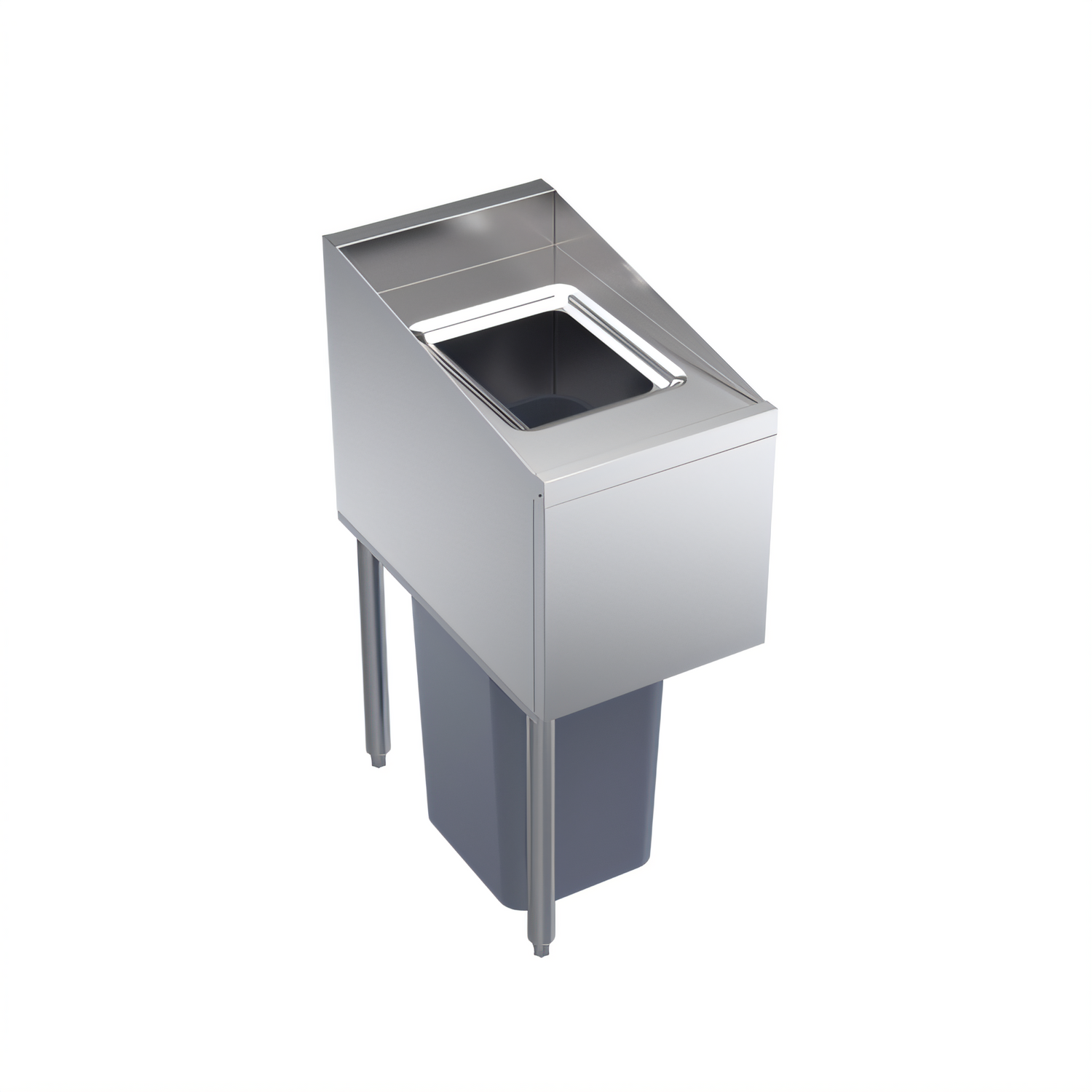 Royal Series Underbar Trash Station, 14"W x 24"D (to match speedrail), opening in top for trash disposal, fits slim jim (up to 30" high), lift-up front door, stainless steel front & sides, (2) legs on left, NSF (TRASH RECEPTACLE NOT INCLUDED)