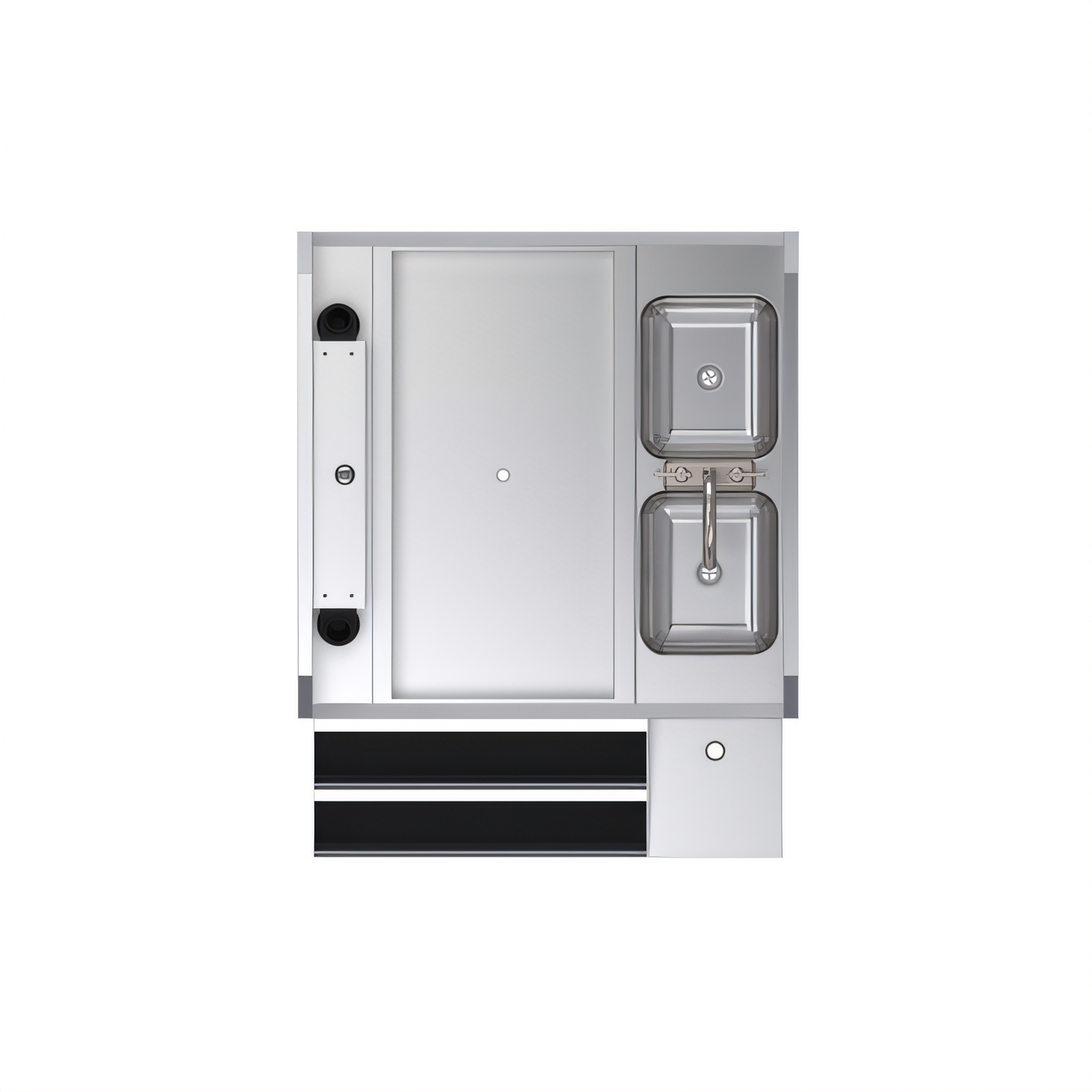 - 24" double speed rail (sound-deadened) holds top-shelf and well bottles within instant reach on both tiers.