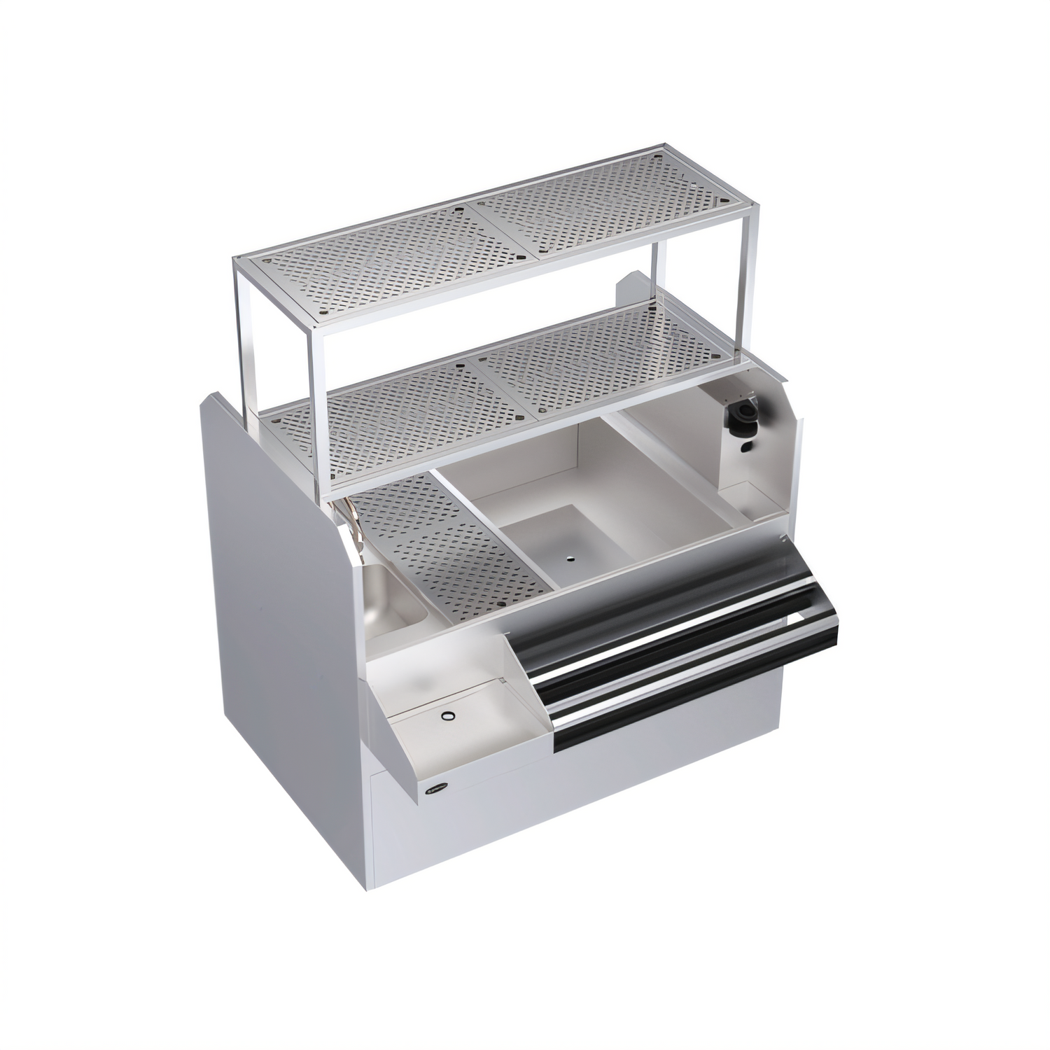 - Pass-thru design lets two bartenders share a single 24" ice well without reaching over each other.