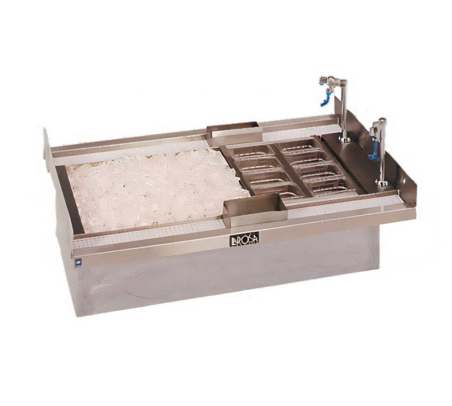 - Full-length troughs (both sides) with removable 18 GA grates & perforated waste containers
