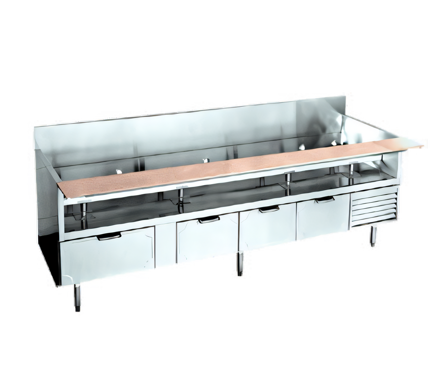 - 102″ W x 30″ D four-section base with (4) refrigerated drawers