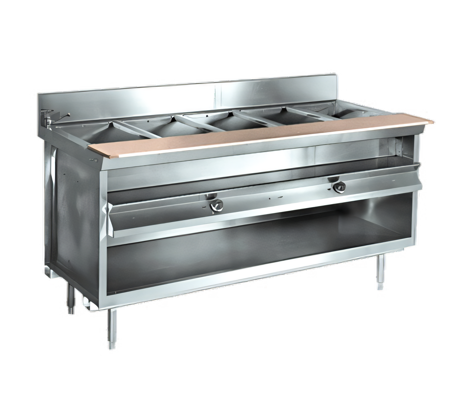 - Open cabinet base with 8" deep stainless plate shelf plus integral dish shelf keeps essentials at arm’s reach.