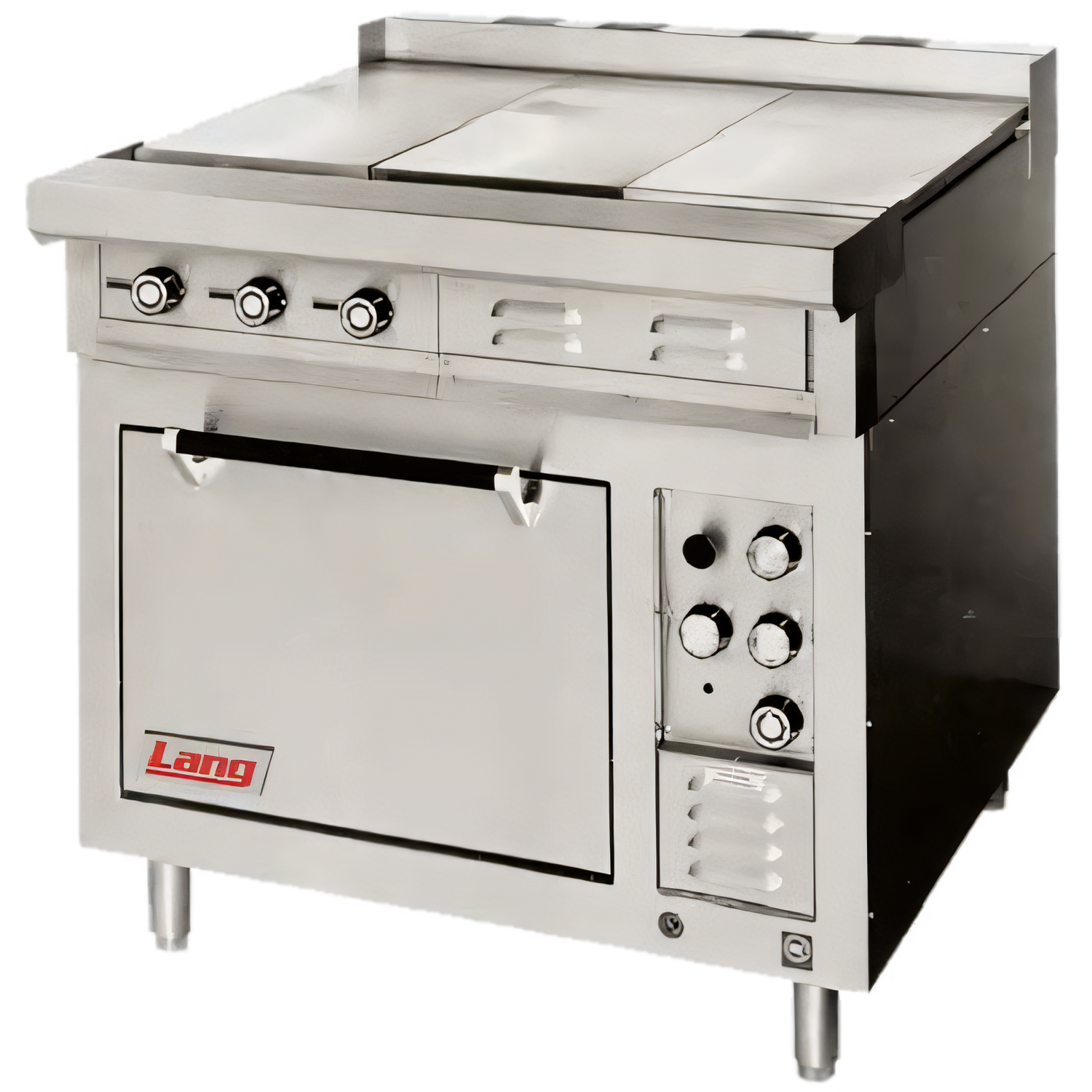 Lang Manufacturing | Model R36S-ATBBuilt for high-volume restaurants, institutions and production kitchens, the Lang 36" Heavy-Duty Electric Range delivers robust hot-top performance with a full-size oven base – all inside a stainless-steel cabinet that stands up to daily punishment.