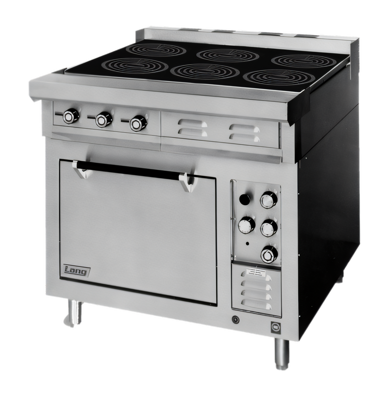 6-Zone Glass Induction Top • 21.6 kW • cULus & NSF ListedBring the speed, accuracy and energy savings of induction to your cookline with the Lang RI36S-ATE. This heavy-duty, all-electric range pairs six powerful 8" induction hobs with a spacious, easy-to-use standard oven—ideal for restaurants, hotels and institutional kitchens looking to modernize without gas.