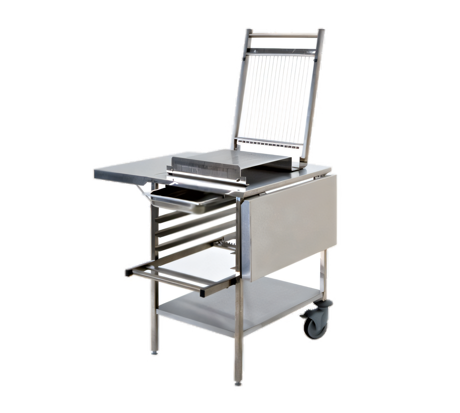 Guitar Slicer Trolley, 48-7/8" x 30-3/4" overall surface, 21-1/4" x 26-3/4" working plate, (2) folding side tables, slide out drawer (4) racks, (2) pivot wheels with brakes and adjustable cylinder, stainless steel (guitar slicer not included)