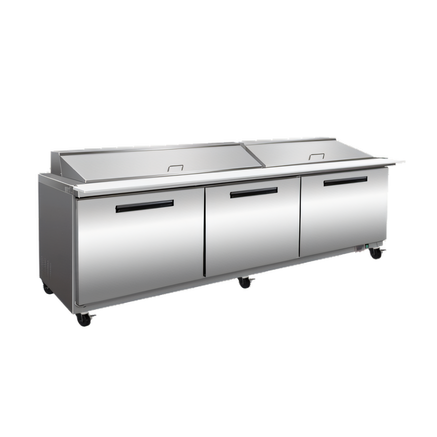Maxx Cold X-Series 72" Megatop Sandwich & Salad Station, 18.0 cu. ft. storage capacity, three-section, (3) adjustable shelves, (3) hinged door with recessed handle, electronic thermostat & digital LED temperature display, self-contained cooling system, stainless steel exterior, painted aluminum interior, insulated top cover, (4) caster (2 locking & non-locking), R134A refrigerant, 1/2 HP rear mounted compressor, includes: cutting board & (30) 1/6 size polycarbonate pans, cULus, UL EPH Classified