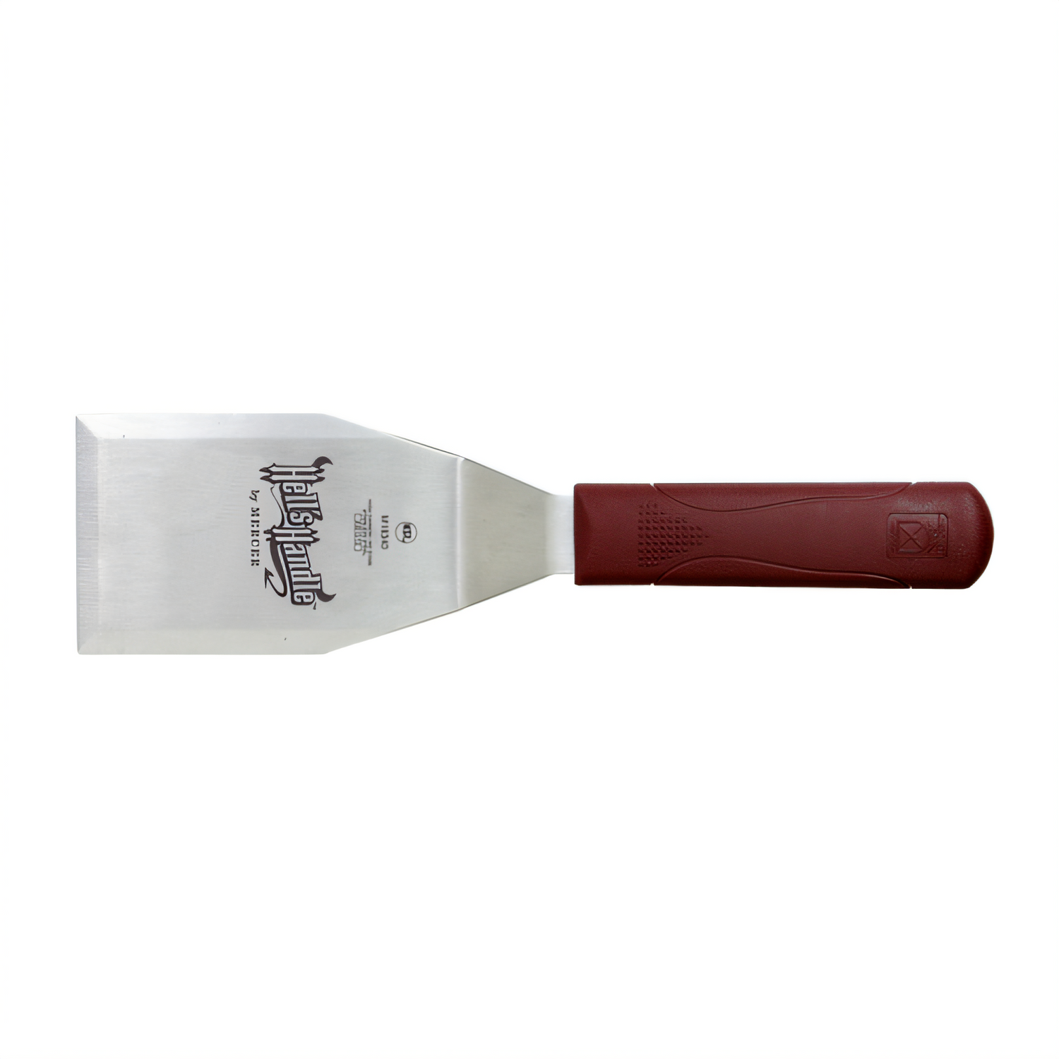 Heavy-duty Mercer Hell's Handle Turner, 11-3/8", Japanese stainless, heat-resistant to 450°F, slip-resistant grip, NSF certified.