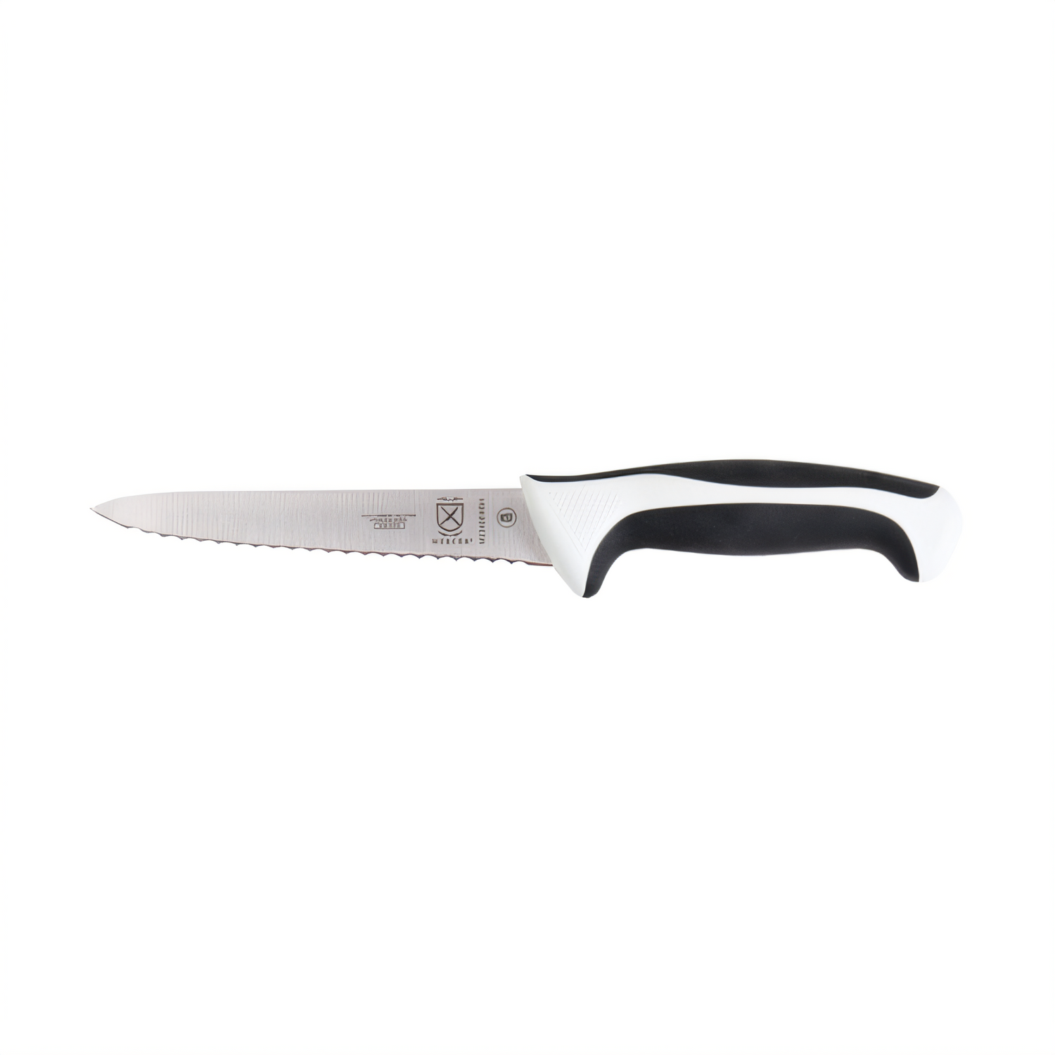 Mercer Millennia 6" wavy-edge utility knife — high-carbon Japanese steel, NSF, non-slip white Santoprene handle for safe precise cuts.
