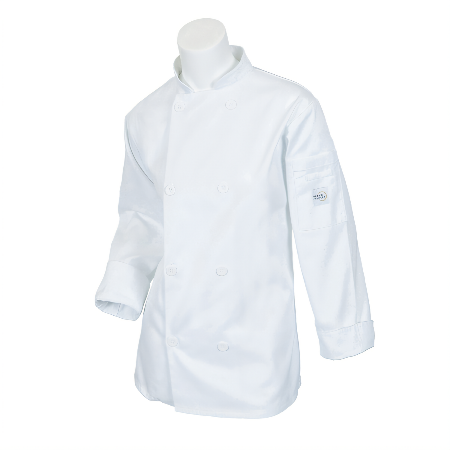 Millennia® Women's Chef Jacket, (8) traditional buttons, shoulder pocket, center back kick pleat, 65/35 poly/cotton twill, white, x-small