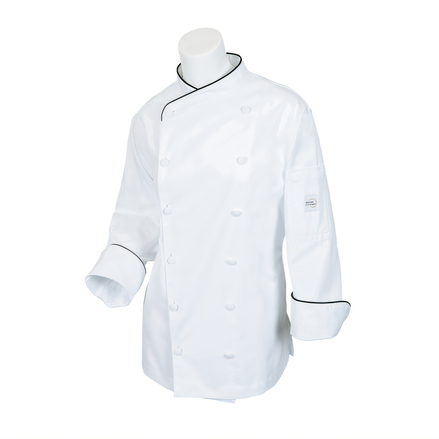 Mercer Culinary Women's Renaissance Chef Coat, scoop neck, cloth buttons, utility pocket, earbud slot, white with black piping, medium.