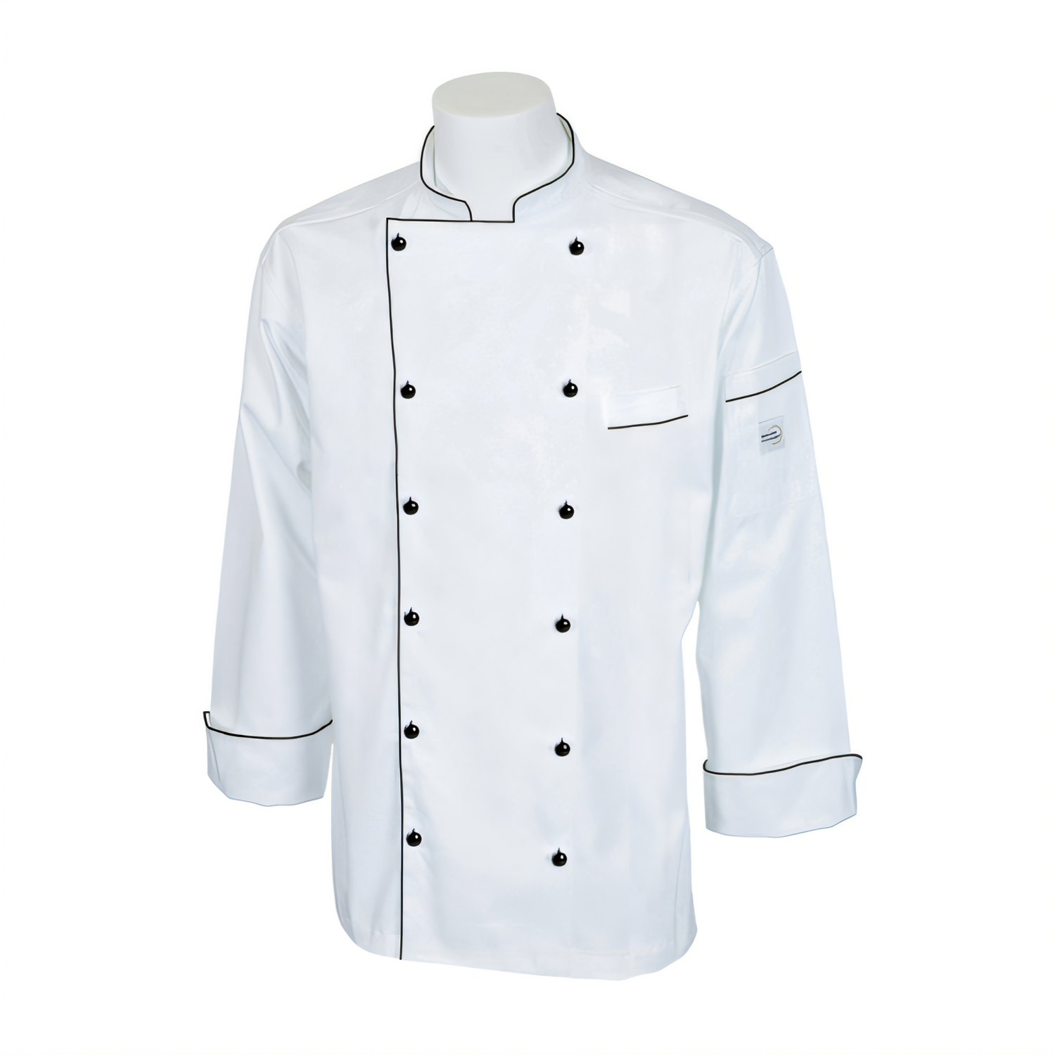 Renaissance Men's Jacket, traditional neck, (12) push through black buttons, utility shoulder pocket, chest welt pocket, 65/35 poly/cotton twill, white with full black piping, small