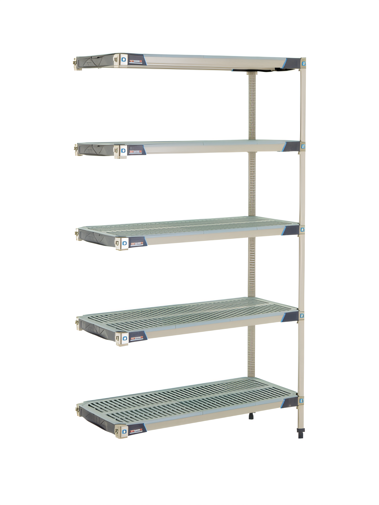 MetroMax® i Add-On Shelving Unit, 42"W x 18"D x 74"H, rust proof, 1000 lb capacity per shelf, 2000 lb. capacity per unit, includes: (5) open grid polymer shelves with reinforced type 304 stainless steel corners and removable polymer shelf mats, bag of (4) wedge connectors included with each shelf, (2) polymer posts & (10) "S"Hooks for an end-to-end configuration, Microban antimicrobial product protection, KD, NSF