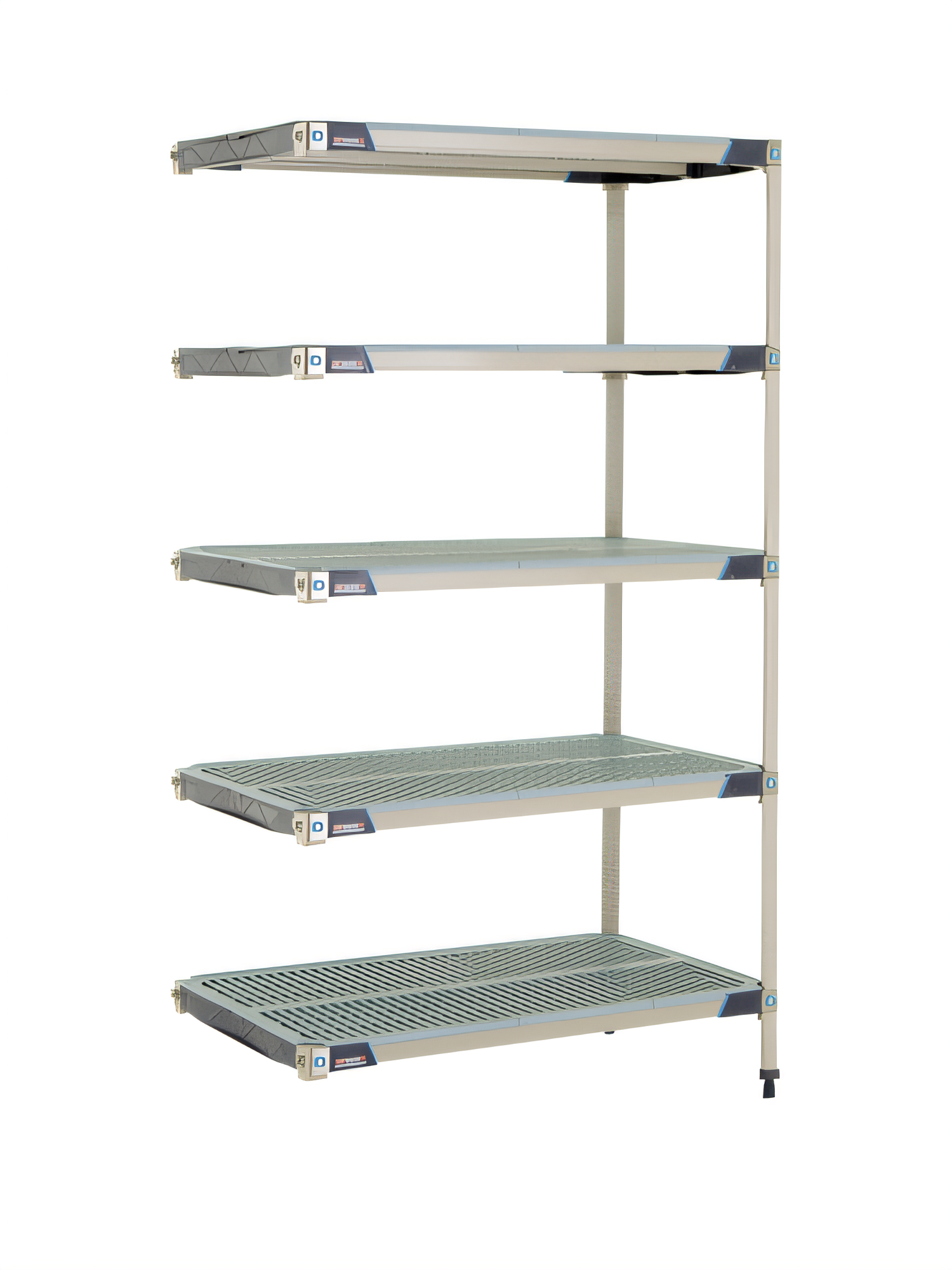 MetroMax® i Add-On Shelving Unit, 42"W x 24"D x 74"H, rust proof, 1000 lb capacity per shelf, 2000 lb. capacity per unit, includes: (5) open grid polymer shelves with reinforced type 304 stainless steel corners and removable polymer shelf mats, bag of (4) wedge connectors included with each shelf, (2) polymer posts & (10) "S"Hooks for an end-to-end configuration, Microban antimicrobial product protection, KD, NSF