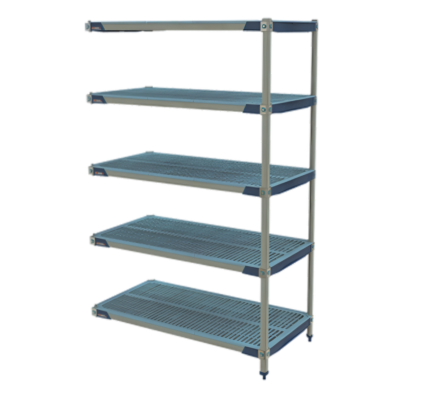 MetroMax® i Add-On Shelving Unit, 60"W x 24"D x 74"H, rust proof, 750 lb capacity per shelf, 2000 lb. capacity per unit, includes: (5) open grid polymer shelves with reinforced type 304 stainless steel corners and removable polymer shelf mats, bag of (4) wedge connectors included with each shelf, (2) polymer posts & (10) "S"Hooks for an end-to-end configuration, Microban antimicrobial product protection, KD, NSF