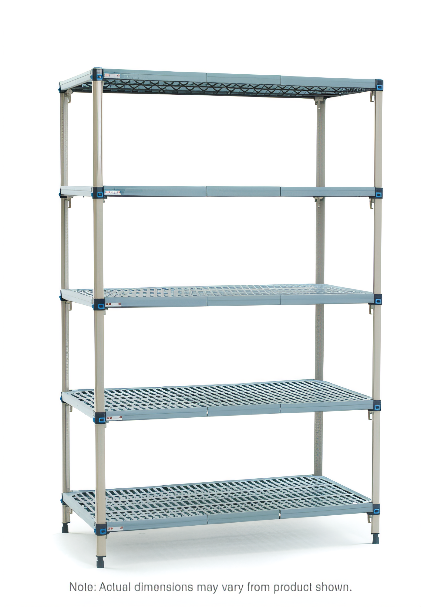 MetroMax® Q Starter Shelving Unit, 30"W x 21"D x 74"H, 800 lb. capacity per shelf, 2000 lb. capacity per unit, (5) quick-adjust shelves with removable polymer open-grid shelf mats and epoxy coated one-piece steel frames, (4) polymer posts, Microban antimicrobial product protection, KD, NSF