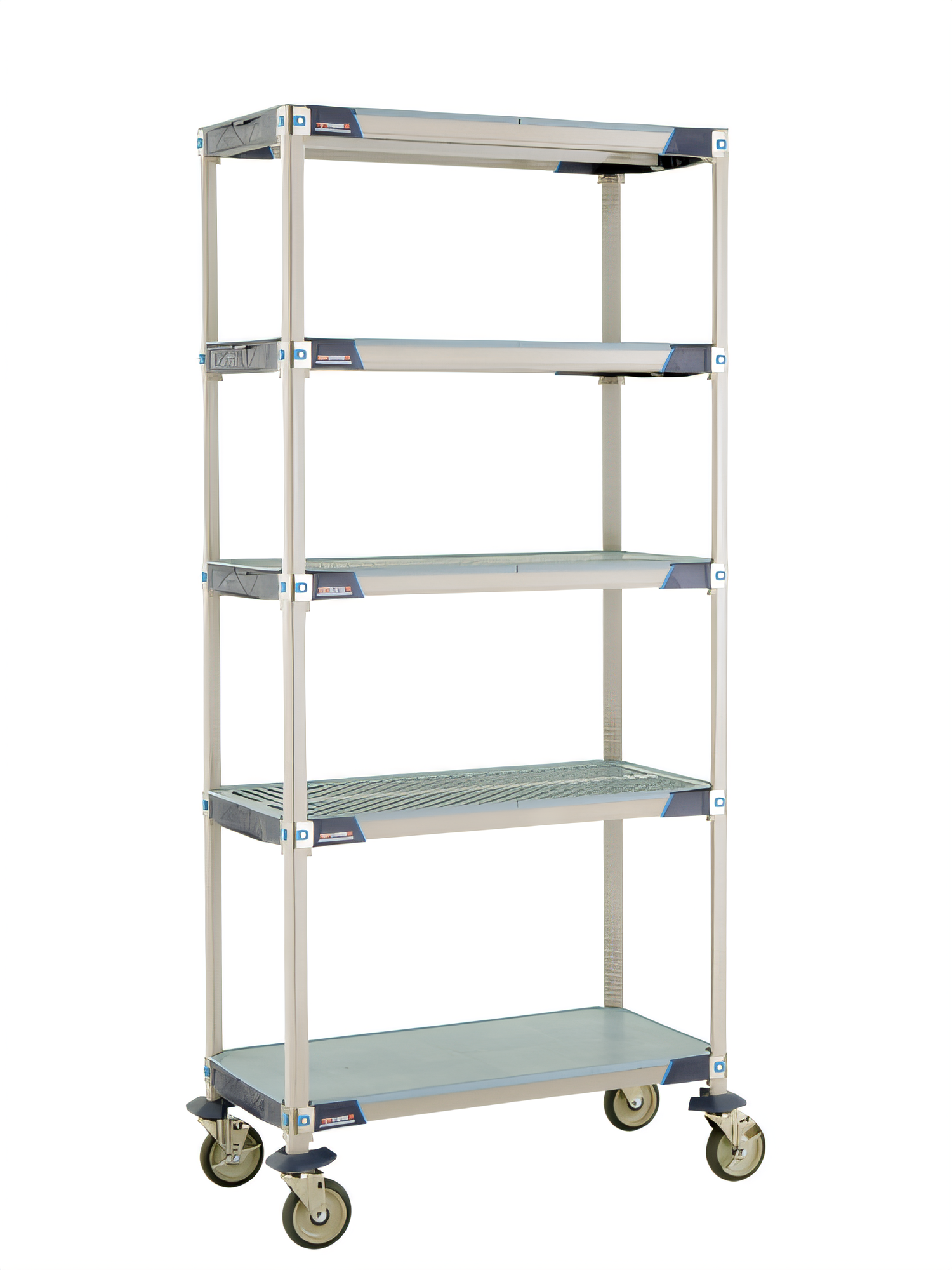 MetroMax® i Mobile Shelving Unit, 36"W x 18"D x 80"H, (4) corrosion proof open grid shelves with removable shelf mats & (1) corrosion proof solid shelf with removable shelf mat, 800 lb. capacity per shelf, (4) polymer posts (MX74UP), built in antimicrobial product protection, (4) stem casters, NSF