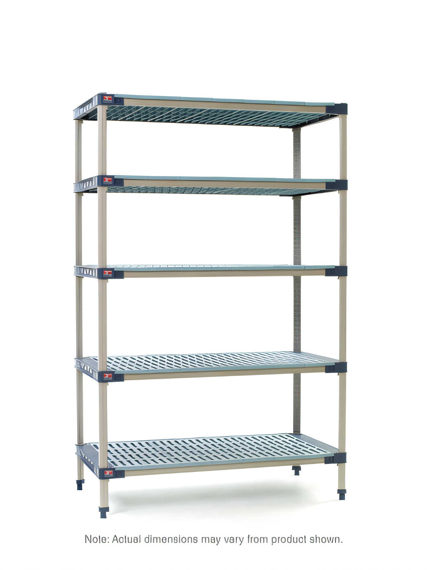 MetroMax® 4 Starter Shelving Unit, 48"W x 18"D x 74"H, rust proof, 800 lb. capacity per shelf, 2000 lb. capacity per unit, (5) open grid all-polymer shelves with removable shelf mats, bag of (4) wedge connectors for each shelf, (4) polymer posts, Microban antimicrobial product protection, KD, NSF